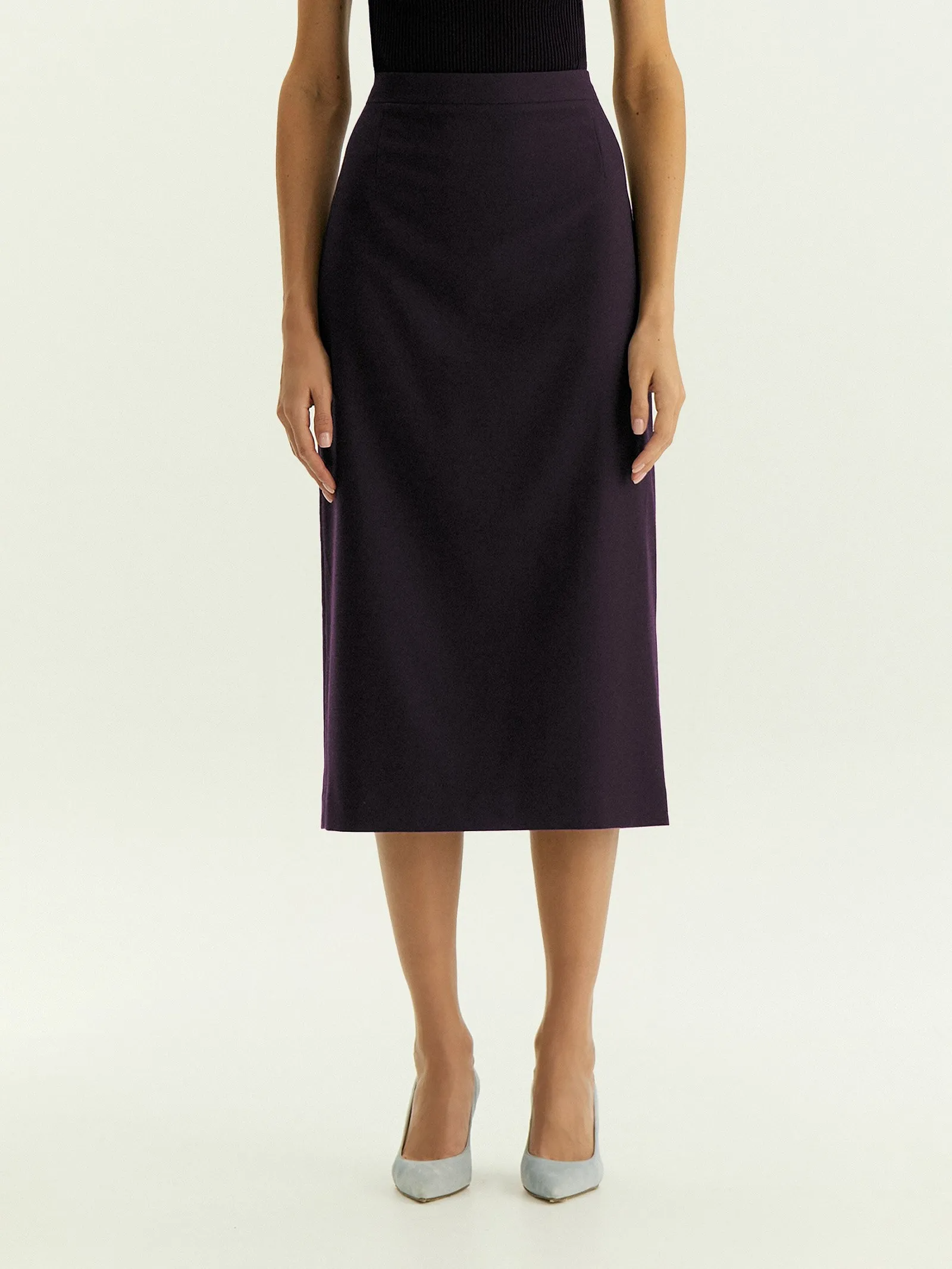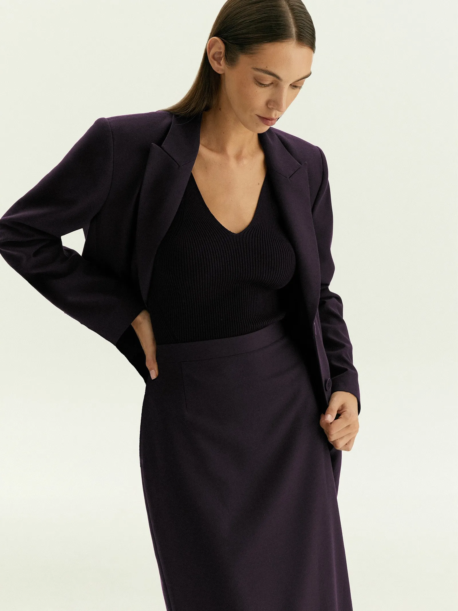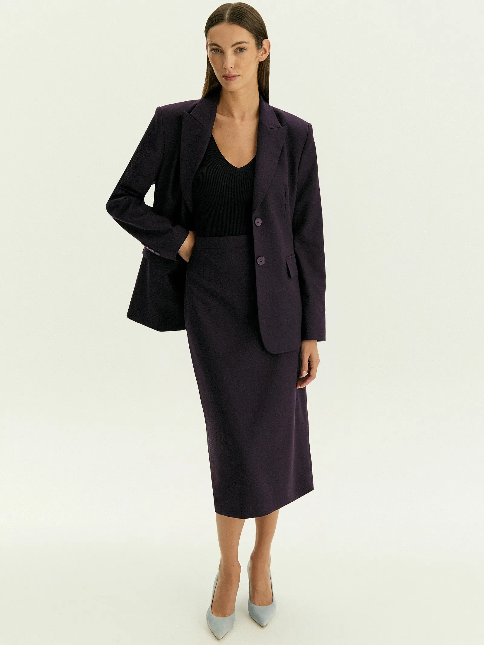 Юбка-карандаш в трендовом цвете инжира — основа актуальных деловых образов. Дополнить её можно жакетом из комплекта и нежной блузой, с принтом или без.