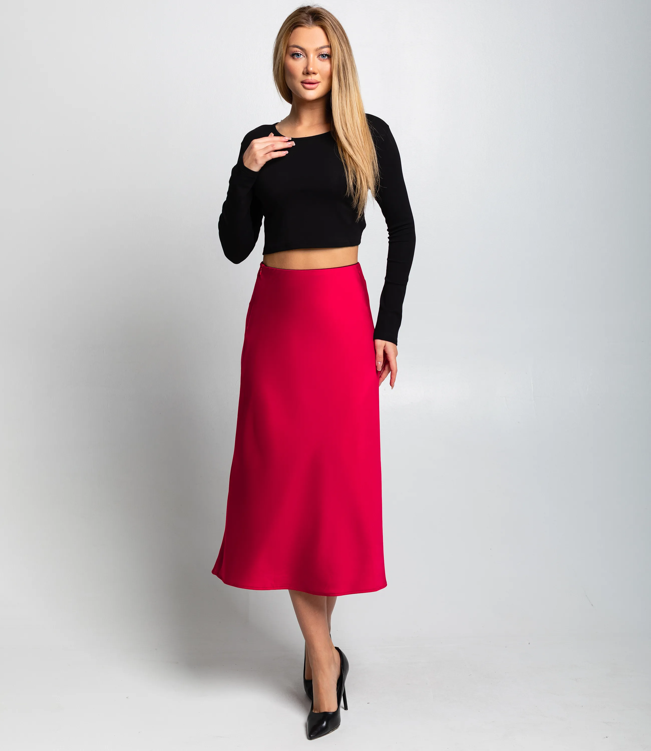 Юбка из атласа позволят сиять на торжественных мероприятиях. Гладкая материя с незаметным переплетением нитей подчеркивает красоту женского тела.
