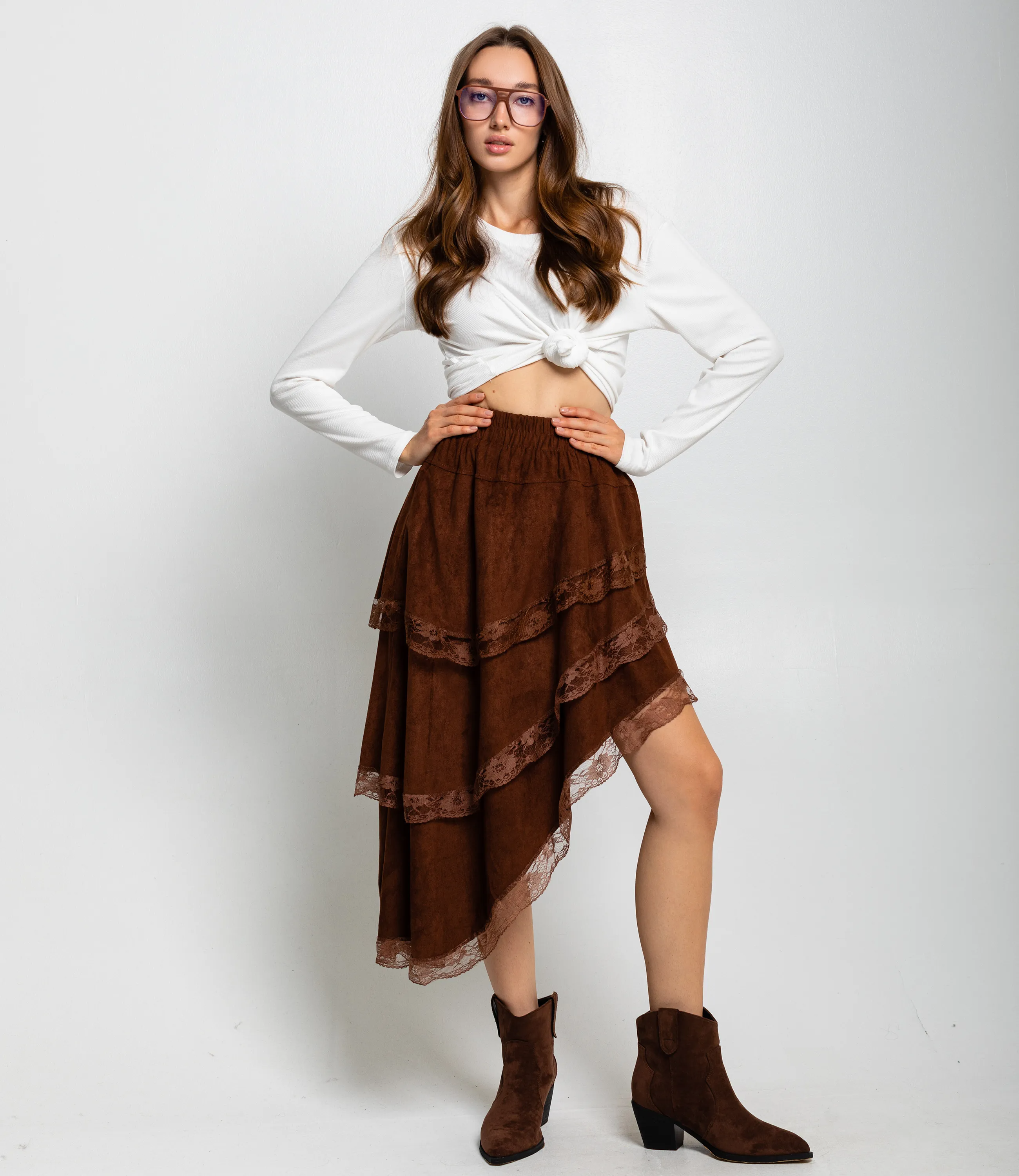 Эта юбка — идеальный элемент гардероба, который привлечет внимание ваших покупателей и добавит изысканности в их образы. Выполненная из 60% полиэстер, 35% хлопок. Юбка асимметричная миди с укороченной правой и удлинённой левой стороной, расклешённого силуэта с лёгкими складками. Декорирована несколькими горизонтальными ярусами-воланами с кружевной тесьмой того же оттенка по краям, что добавляет фактурности и романтичности; подол асимметричный с кружевной отделкой. Качество исполнения и современный дизайн делают эту юбку желанным элементом гардероба для девушек, которые ценят стиль и комфорт. На странице сайта представлена таблица размеров, что упростит покупку для клиентов, помогая им выбрать идеальный размер без лишних трудностей. Установленная цена делает эту юбку доступной, что способствует её популярности среди покупателей. Рост 168 см, 85-63-92.