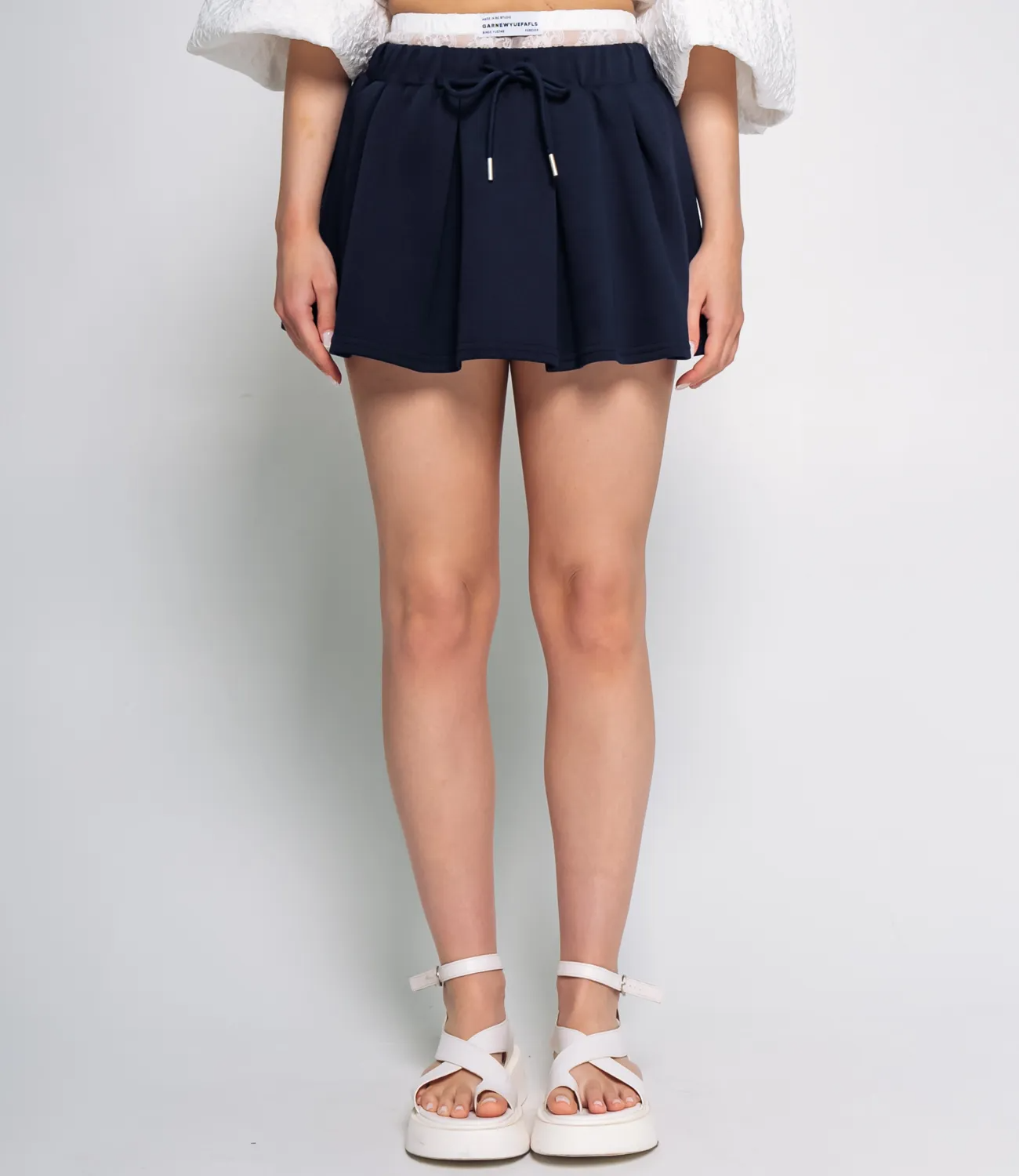 Юбка выполнена из ткани, состоящей из 85% хлопка и 15% полиэстера, что придаёт изделию мягкость и натуральность хлопка с добавлением прочности и легкой эластичности за счет полиэстера. Юбка свободно расширяется книзу. Талия оформлена широкой, эластичной резинкой с внутренним широким вставным поясом из прозрачного материала с декоративным узором, что обеспечивает удобство посадки по фигуре и добавляет необычный дизайнерский акцент. Спереди находится шнурок, оформленный в форме завязок, позволяющий дополнительно регулировать посадку на талии и служащий стильным декоративным элементом. Концы шнурка дополнены металлическими наконечниками для придания аккуратного вида. Ткань хорошо драпируется и сохраняет форму, благодаря плотной структуре и высокому содержанию хлопка. Длина юбки короткая, акцентирующая ноги и создающая свежий, молодежный, и в то же время комфортный образ. Такая юбка отлично подходит для повседневной носки и может объединяться с различными верхами и обувью, создавая стильные и удобные комплекты. Рост 168, 85-63-92.