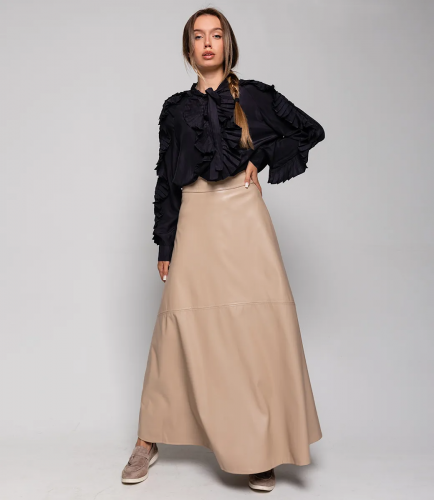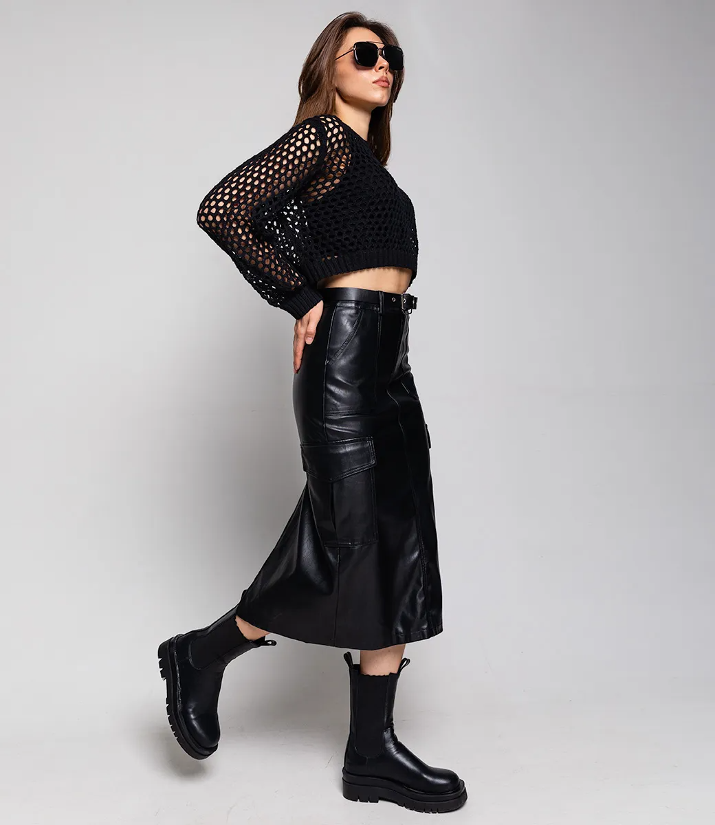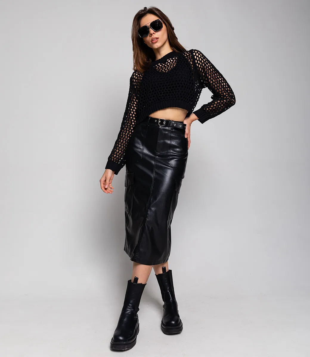 Юбка из эко-кожи с ремнем и небольшим разрезом сзади сделает образ более дерзким и притягательным.