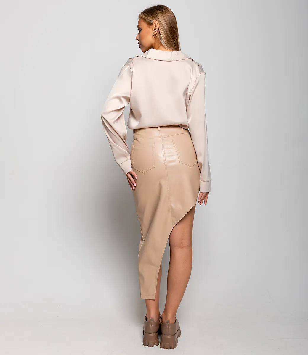Кожаная длинная юбка с укороченным боком - это смелое и гламурное дополнение к гардеробу современной женщины. Она обладает соблазнительной и роскошной внешностью, привлекая внимание своим провокационным стилем и уникальным дизайном.