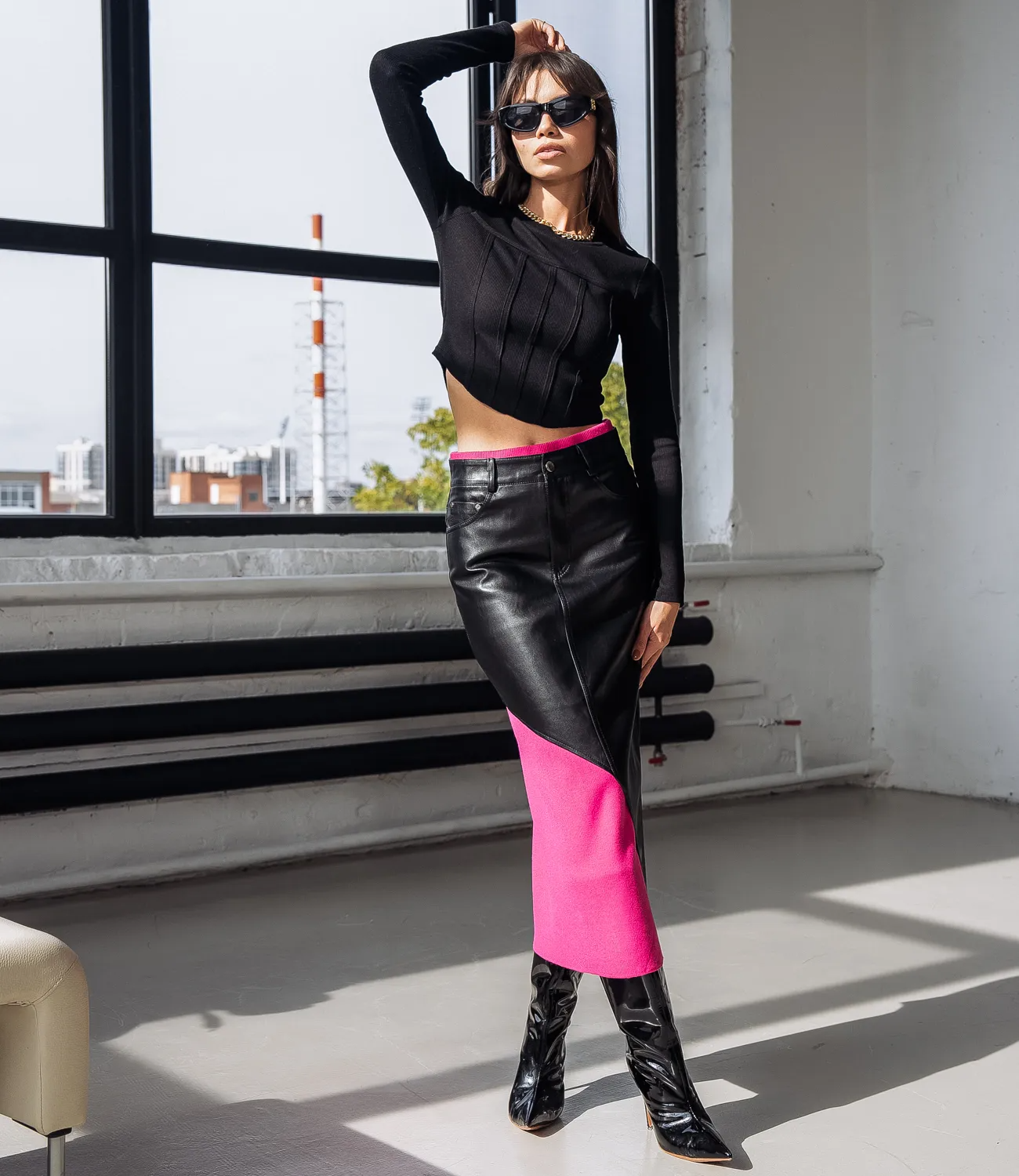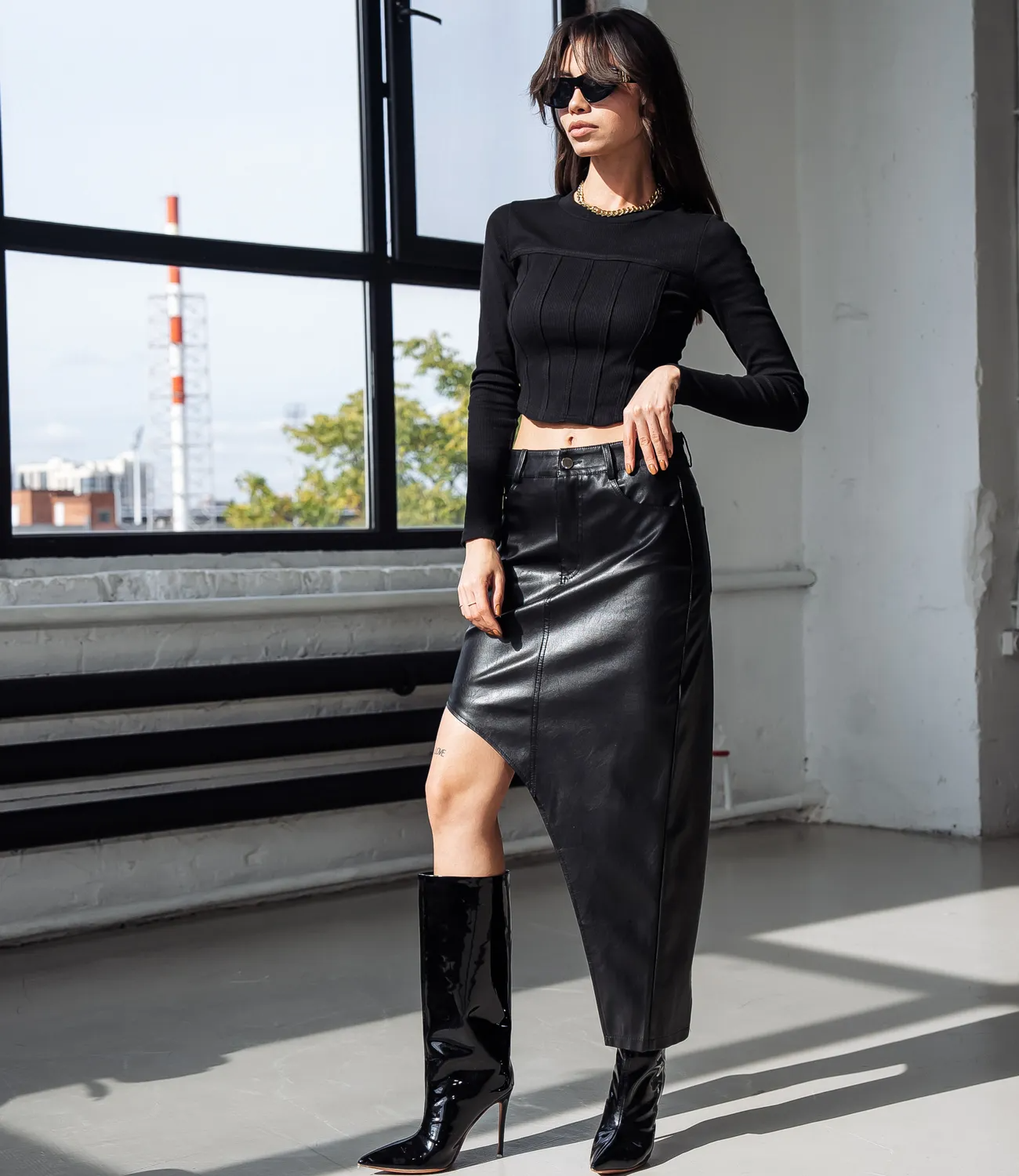 Кожаная длинная юбка с укороченным боком - это смелое и гламурное дополнение к гардеробу современной женщины. Она обладает соблазнительной и роскошной внешностью, привлекая внимание своим провокационным стилем и уникальным дизайном.