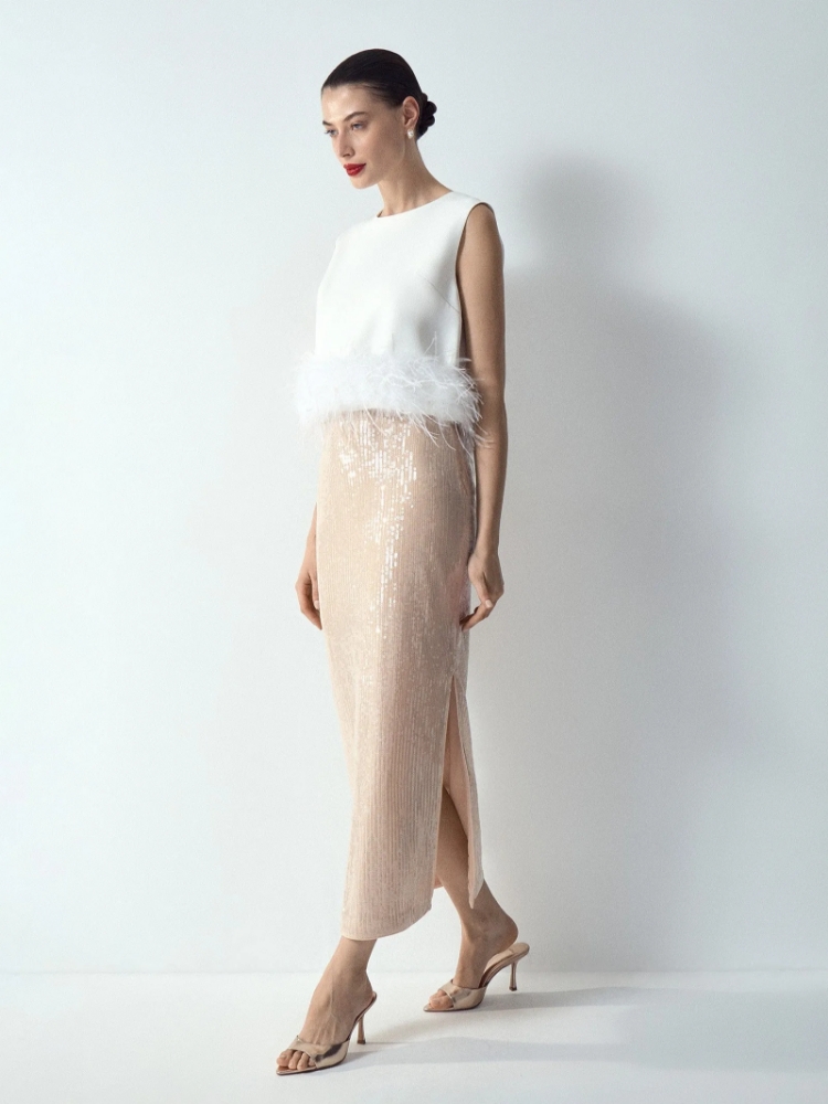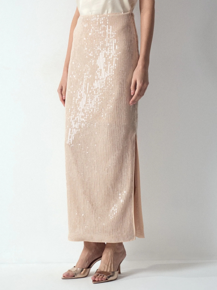 Юбка с пайетками цвета шампанского очень удобна в гардеробе. Она мгновенно трансформирует любой образ в коктейльный или праздничный. Её можно носить и с нарядными топами, и с простыми футболками. Под пайетками — эластичная трикотажная основа: элементы декора не будут ощущаться, не создадут дискомфорт и не зацепят колготки. Модель прямого силуэта имеет трендовый акцент: разрез сзади. Застёгивается на молнию