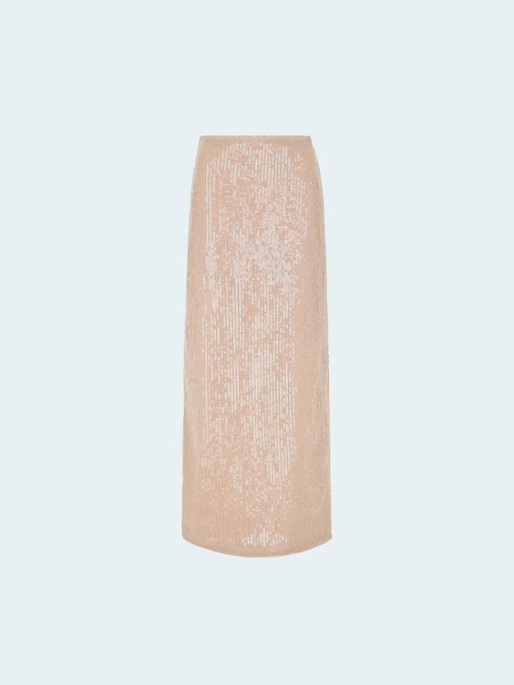 Юбка с пайетками цвета шампанского очень удобна в гардеробе. Она мгновенно трансформирует любой образ в коктейльный или праздничный. Её можно носить и с нарядными топами, и с простыми футболками. Под пайетками — эластичная трикотажная основа: элементы декора не будут ощущаться, не создадут дискомфорт и не зацепят колготки. Модель прямого силуэта имеет трендовый акцент: разрез сзади. Застёгивается на молнию