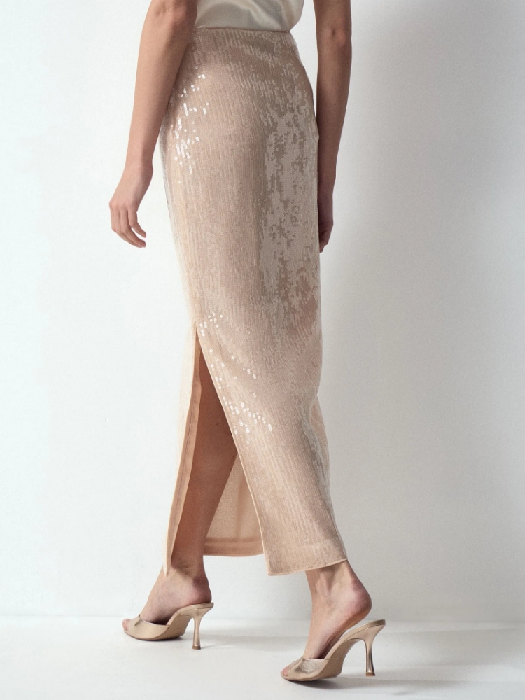 Юбка с пайетками цвета шампанского очень удобна в гардеробе. Она мгновенно трансформирует любой образ в коктейльный или праздничный. Её можно носить и с нарядными топами, и с простыми футболками. Под пайетками — эластичная трикотажная основа: элементы декора не будут ощущаться, не создадут дискомфорт и не зацепят колготки. Модель прямого силуэта имеет трендовый акцент: разрез сзади. Застёгивается на молнию