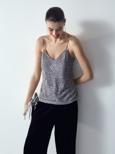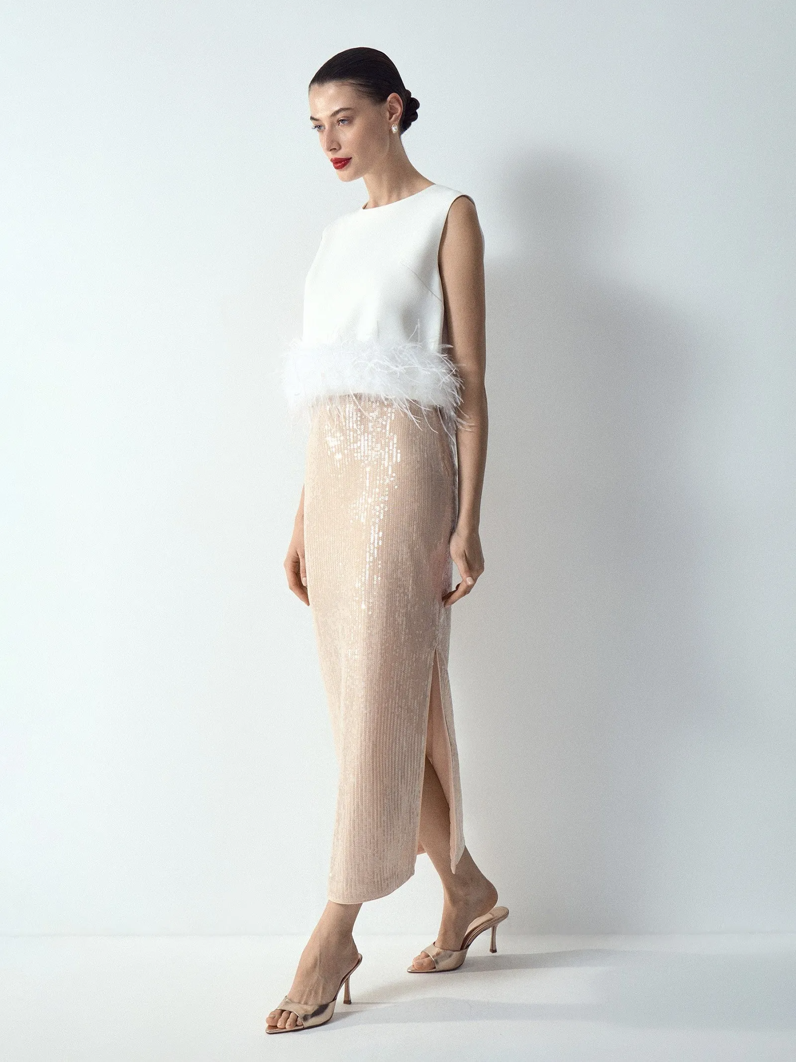 Юбка с пайетками цвета шампанского очень удобна в гардеробе. Она мгновенно трансформирует любой образ в коктейльный или праздничный. Её можно носить и с нарядными топами, и с простыми футболками. Под пайетками — эластичная трикотажная основа: элементы декора не будут ощущаться, не создадут дискомфорт и не зацепят колготки. Модель прямого силуэта имеет трендовый акцент: разрез сзади. Застёгивается на молнию.