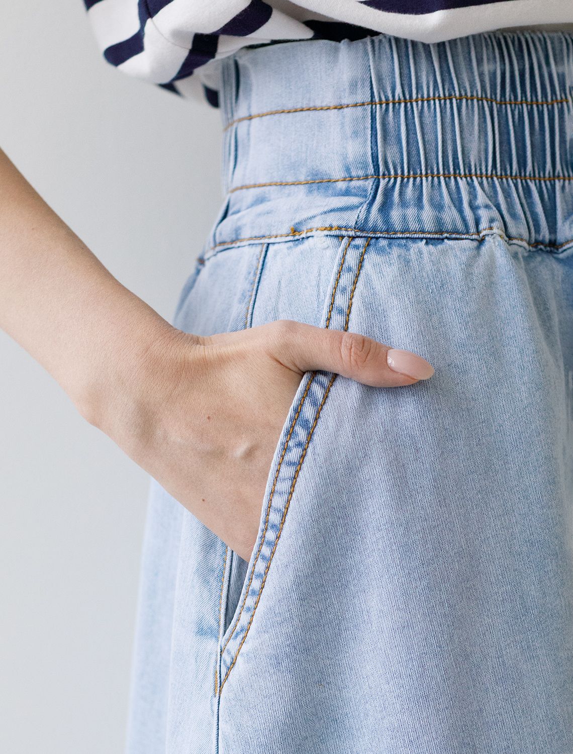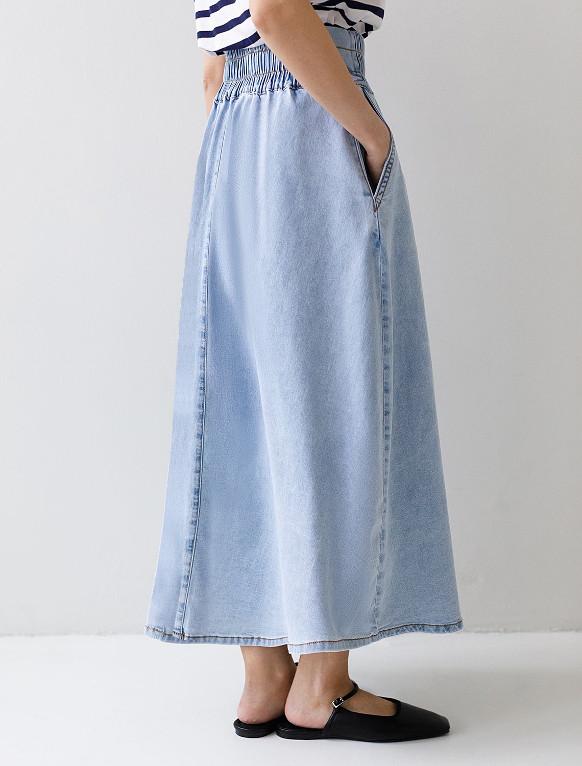 Юбка миди А-силуэта с поясом на резинке из облегченного денима D56.128 светло-голубой