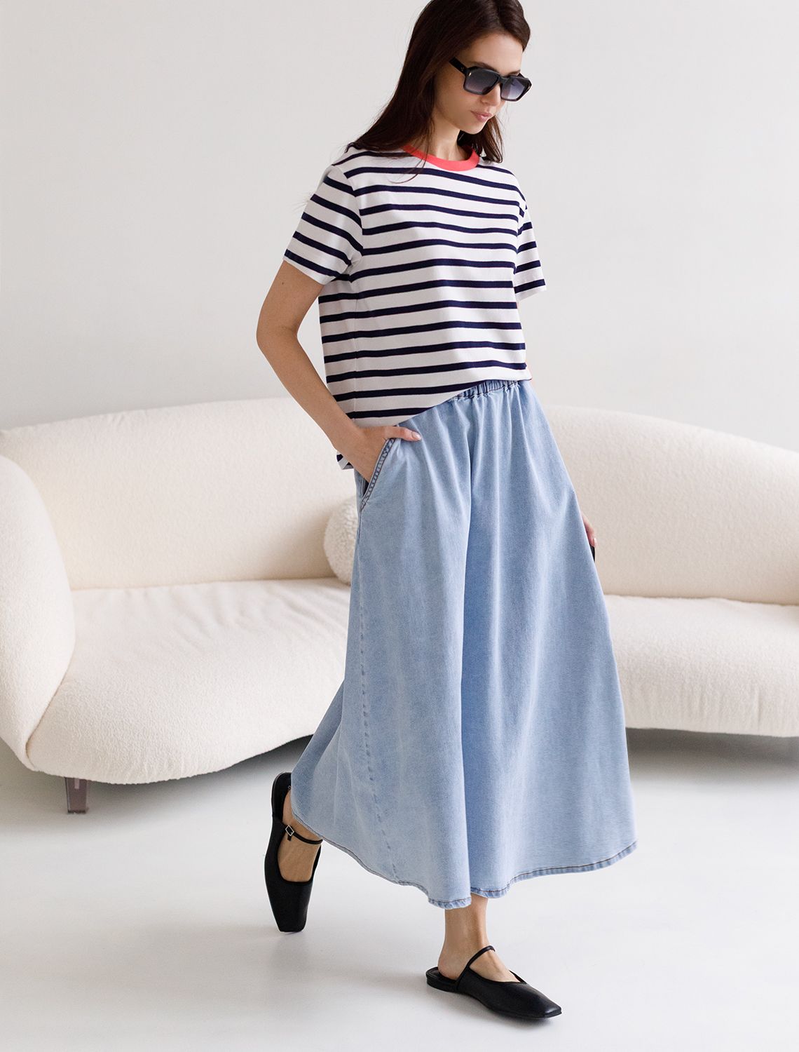 Эффектная юбка миди светло-голубого цвета А силуэта выполнена из облегченного денима плотностью 8 OZ и идеально подойдет для весны и лета. После пошива изделие подвергли специальному виду вошинга — salt-stone washing (солт-стоун вошинг), что дословно значит стирка с каменной солью. Такой вид вошинга позволяет получить стильные потертости на голубых оттенках денима. Особенность модели — широкий пояс на мягкой резинке, который гарантирует удобство в области талии. Мягкий дышащий хлопок почти не ощущается на теле, обеспечивая отличную терморегуляцию в летний период. Совободная юбка идеально подойдет для девушек и женщин размера plus size (плюс-сайз)с широкими бедрами, скроет недостатки и подчеркнет достоинства фигуры. Благодаря универсальному фасону расклешенная юбка подходит на высокий и низкий рост. Невероятно женственная юбка добавит любому образу романтичности. Повседневная джинсовая юбка с карманами по бокам практична и незаменима в современном гардеробе. Универсальную широкую юбку можно сочетать с разными верхами— от классических до кэжуал. Такая стильная юбка станет базовой вещью, способной подчеркнуть индивидуальность и чувство стиля без лишних усилий.