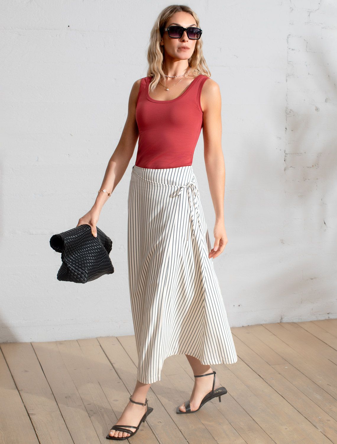 Юбка миди на запАх в полоску из легкого хлопкового поплина D26.207 молочный-синий