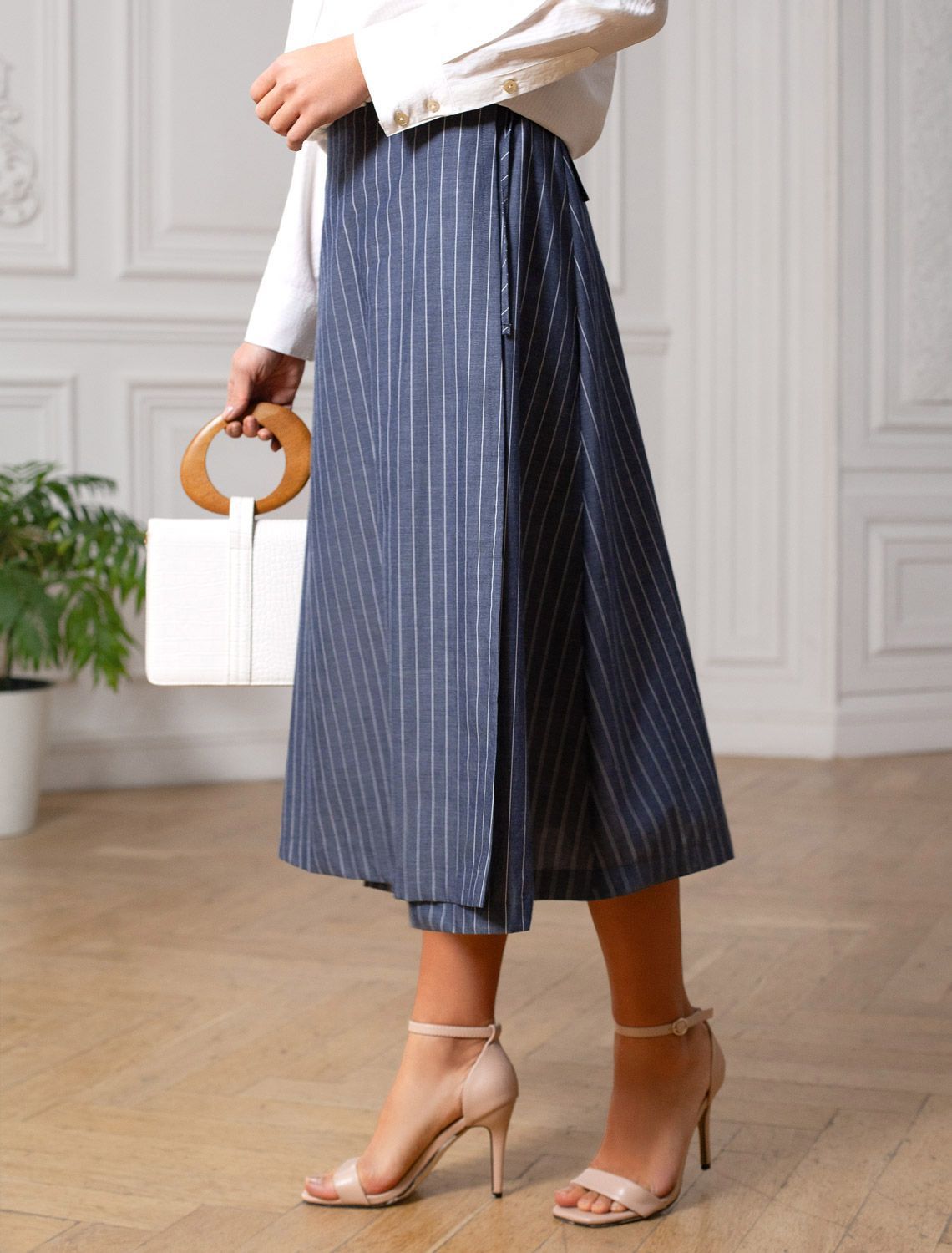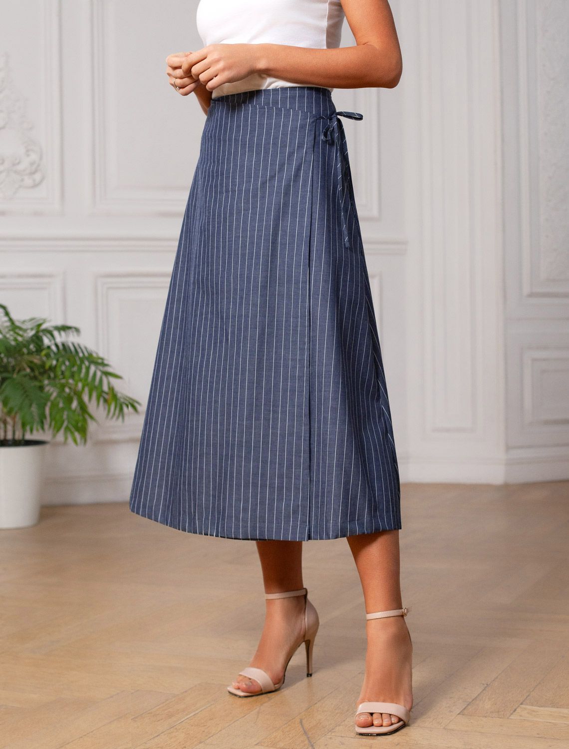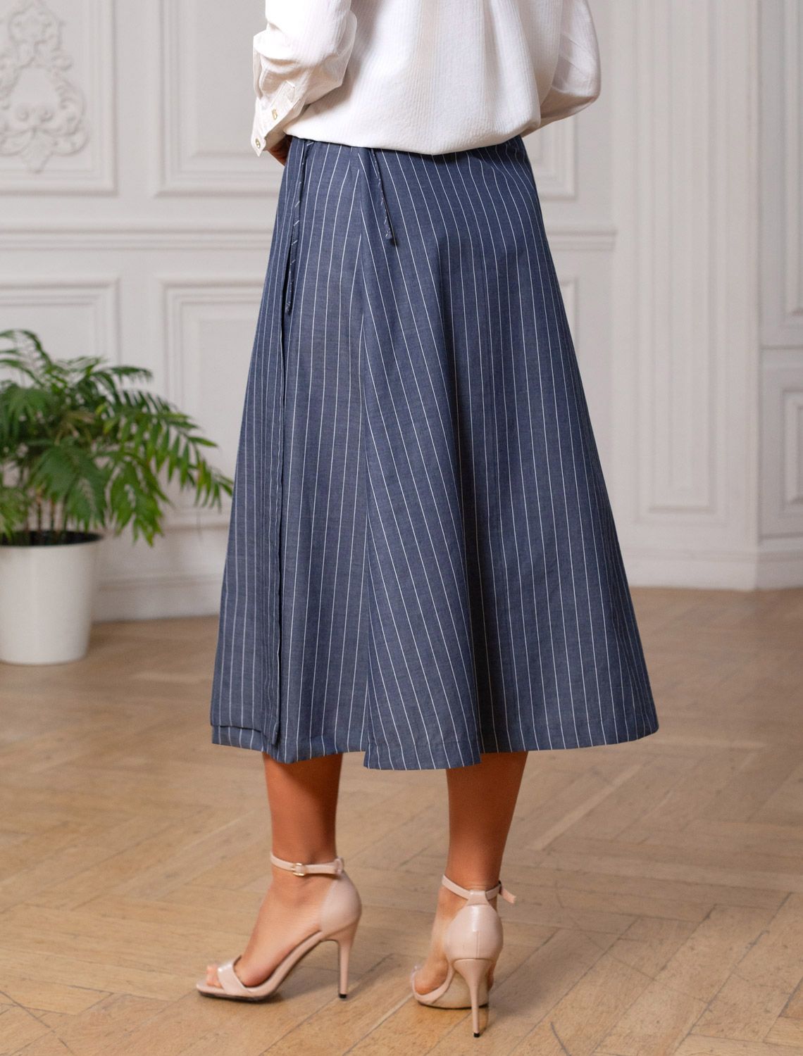 Юбка миди на запАх в полоску из легкого хлопкового поплина D26.207 серо-синий