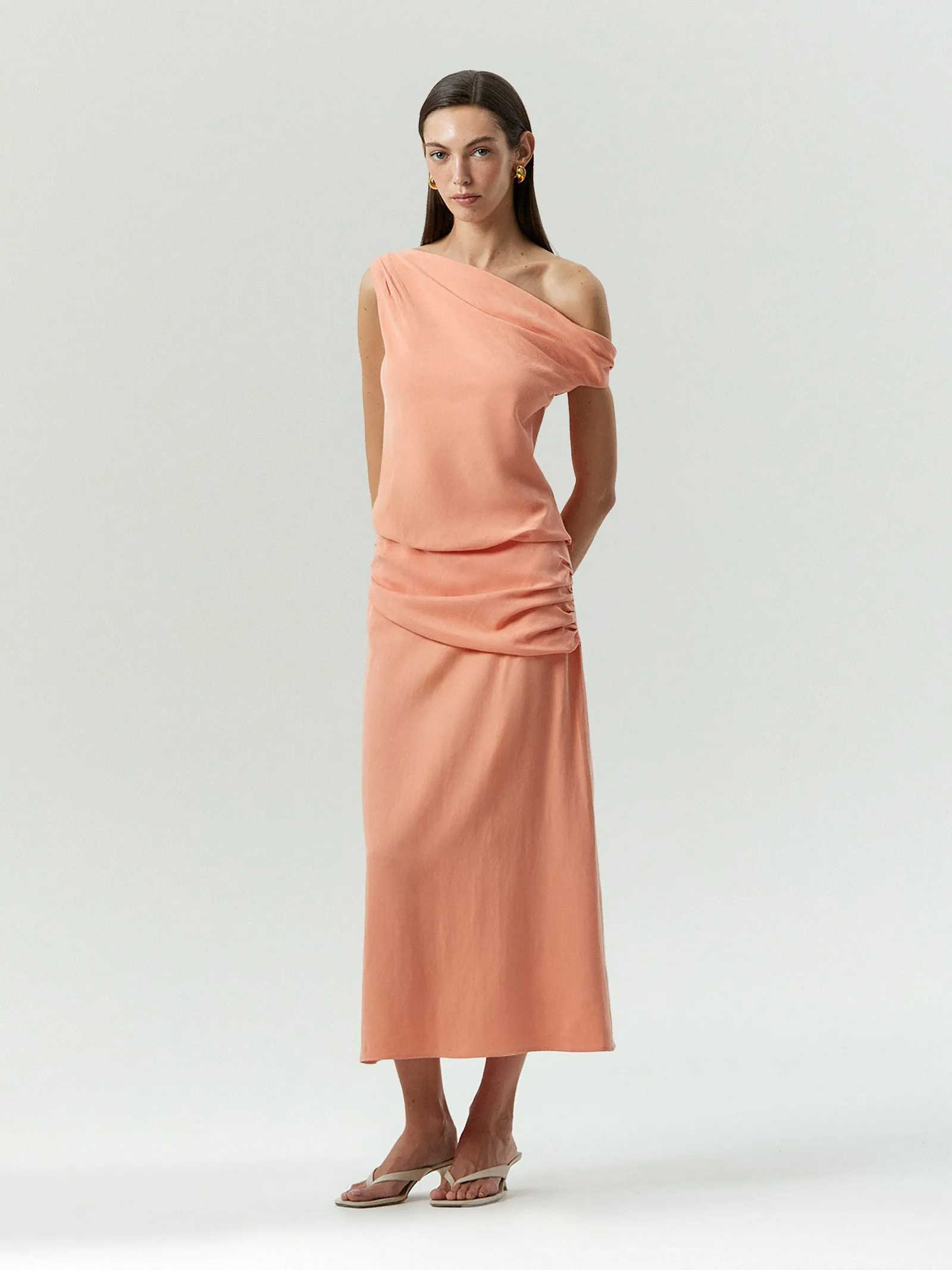 Элегантная и женственная юбка станет любимой вещью в летнем гардеробе. Роскошный цвет мякоти папайи очень актуален в этом сезоне и всегда отлично поднимает настроение. Он освежает, придаёт здоровое сияние, подчёркивает красоту загара. Удобен в стилизациях: его легко сочетать с оттенками бежевого и оливкового, которые найдутся в любом гардеробе, а также с модным оттенком сливочного масла. Материал более чем наполовину состоит из тенсела, а дополняют его вискоза и лён. Ткань красиво облегает тело и хорошо драпируется. Асимметричные драпировки в верхней части юбки сделаны так, чтобы создавать эффект цельного платья вместе с топом из комплекта. Юбка может стать частью капсулы с топом и платьем dous. Также органично смотрится с воздушными летними топами, блузами и рубашками из лёгких тканей в пастельных тонах. Универсальная длина миди и A-силуэт расширяют потенциал стилизаций. Изделие выполнено на подкладке с высоким содержанием вискозы.