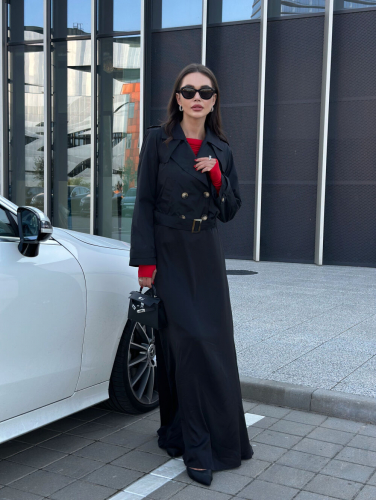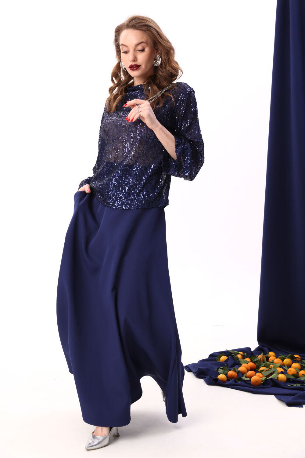 Юбка - солнце макси с узким поясом. В боковых швах расположены карманы. Застёжка на петлю и пуговицу и молнию по спинке.