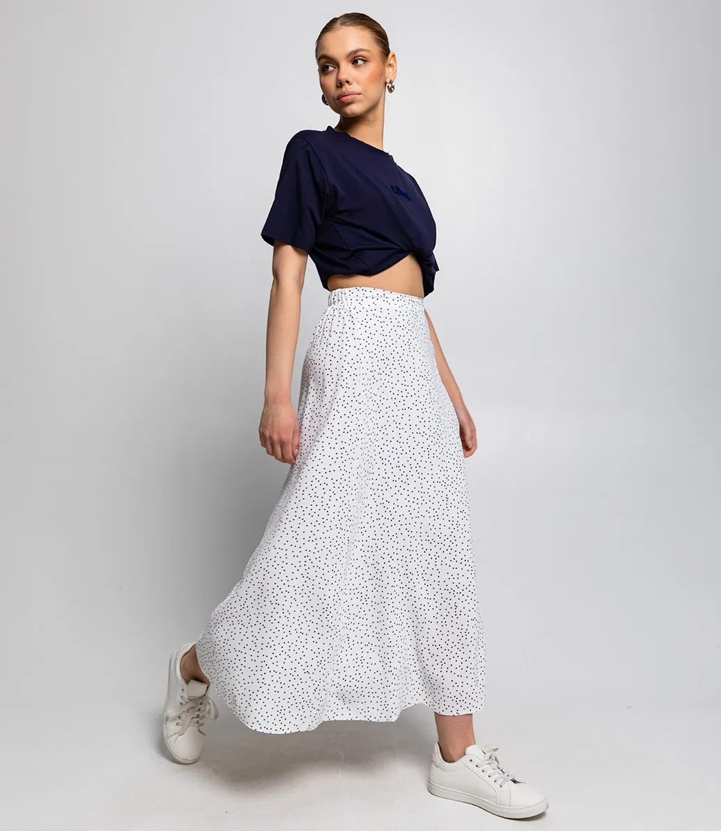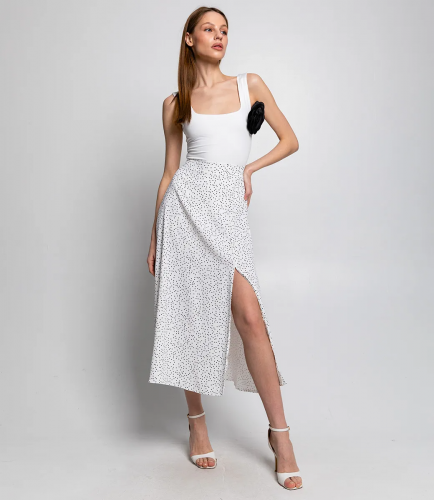 Юбка – это стильный элемент гардероба, который подчеркивает женственность и легкость каждой женщины. Эта модель юбки, представленная на фото, имеет длину до середины икры и свободный, струящийся силуэт, что делает ее идеальным вариантом для летнего сезона. Ее выбирают покупательницы, которые ценят сочетание комфорта и дизайна, который привлекает внимание. Использованный для пошива материал - 100% полиэстер - обеспечивает легкость и воздухопроницаемость, что делает юбку прекрасным выбором на теплую погоду. Талия юбки оформлена резинкой, что гарантирует комфортную посадку и удобство в носке. Этот элемент дизайна позволяет легко адаптировать юбку под различные фигуры, обеспечивая идеальную посадку. Юбка украшена мелким узором в виде горошка, который добавляет интересный акцент и не перегружает общий образ. Она может стать основой как повседневного, так и более нарядного образа, прекрасно сочетаясь с различными блузами или топами. Обратите внимание на универсальность этой модели, которая легко впишется в любой гардероб. Чтобы помочь вашим клиентам выбрать правильный размер, мы подготовили таблицу на сайте, где можно быстро произвести необходимые замеры и удостовериться в своем выборе. Установленная нами цена является доступной для качественного изделия такого класса. Рост модели 168 см., 89-63-90.