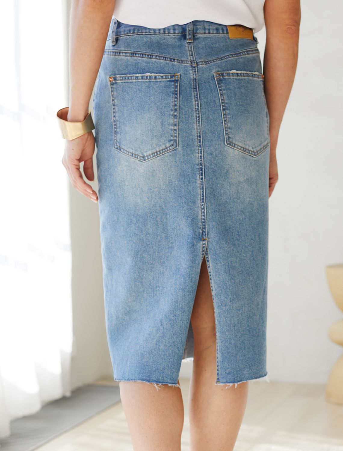 Юбка выполнена из эластичного денима. Модель с трендовой ассиметричной застежкой и декоративной стиркой дополнена краем с открытым срезом и потертостями. Изделие прямого кроя длиной чуть ниже колен с разрезом сзади дополнено брендированным патчем и высококачественной фурнитурой.