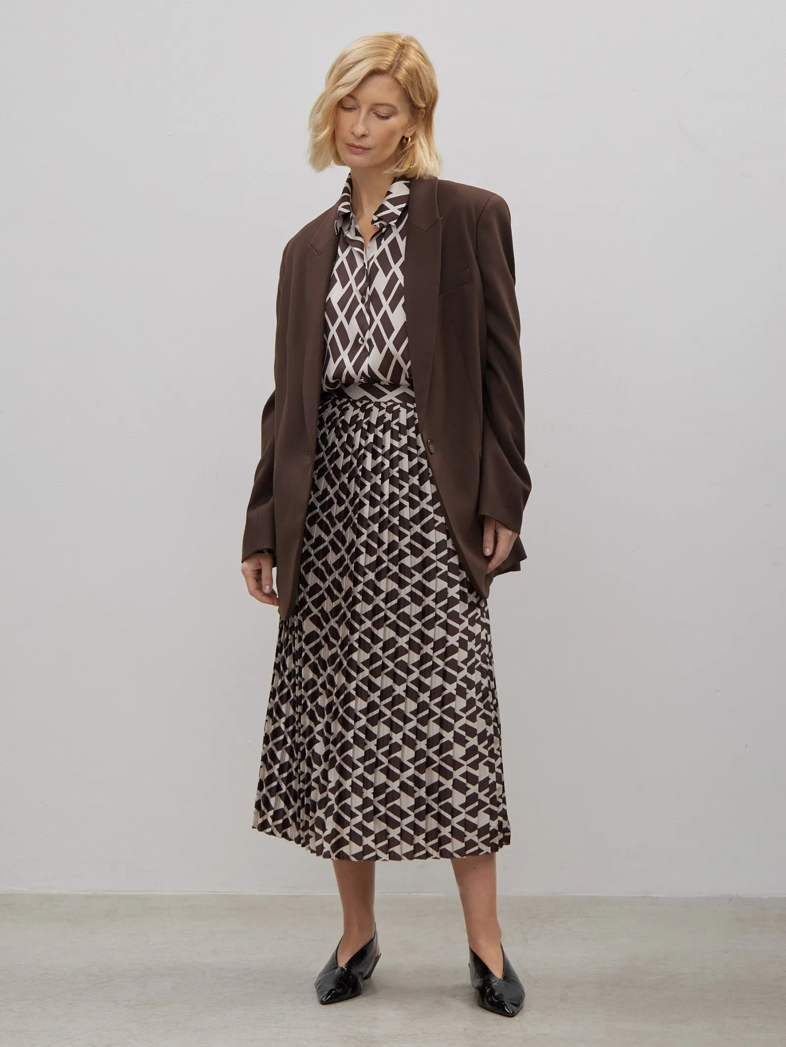 Плиссированная юбка c модным геометрическим принтом. Принт выполнен с сочетанием коричневого и молочного цветов. Модель А-силуэта в длине миди с высокой посадкой подойдёт любому типу фигуры. Изделие изготовлено на подкладке. Застёгивается на потайную молнию в боковом шве. Образ с юбкой можно дополнить рубашкой из комплекта.