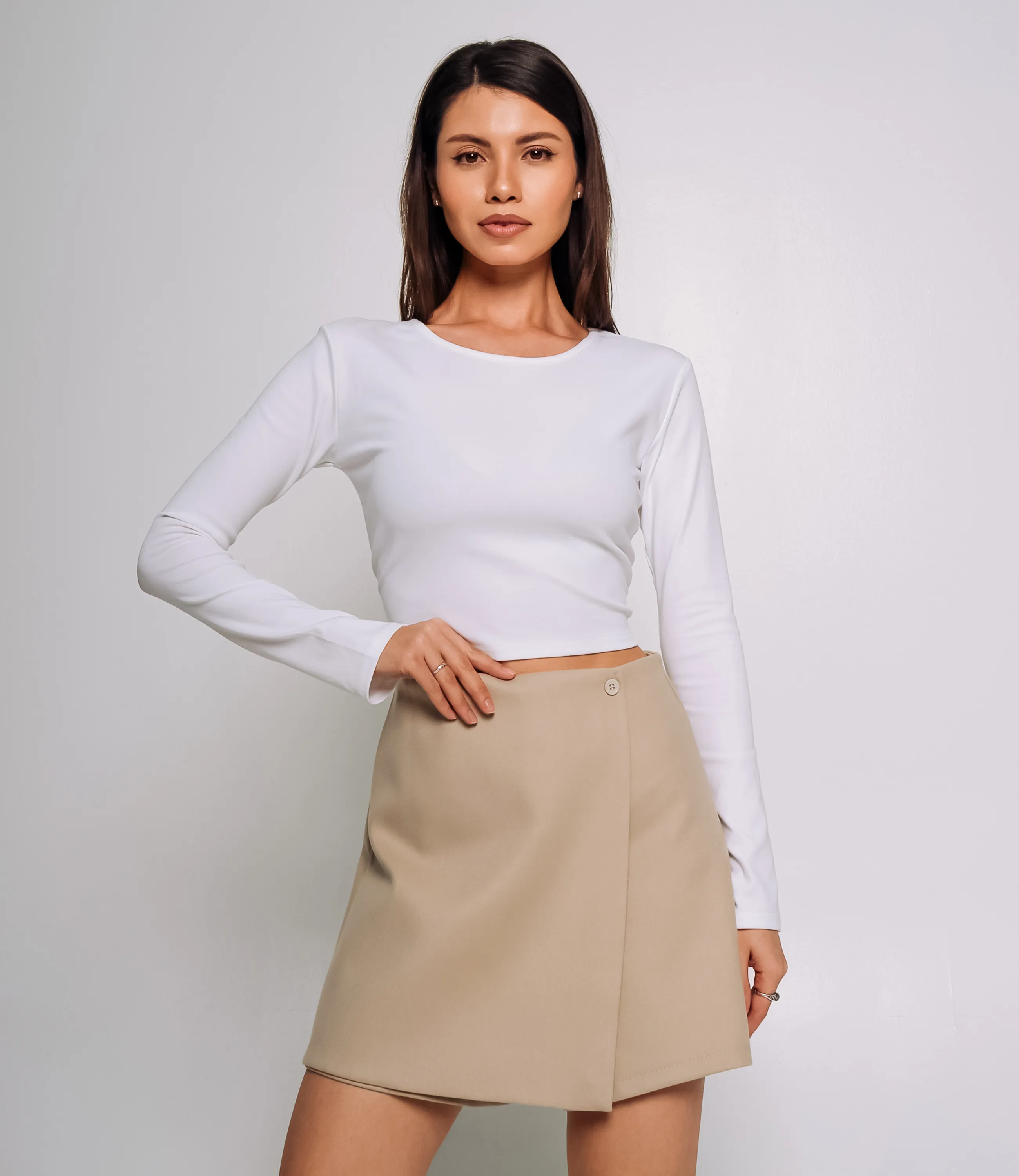 Юбка-шорты выполнена из ткани, состоящей на 80% из хлопка и на 20% из полиэстера. Короткая юбка‑шорты прямого, слегка расклешённого силуэта до середины бедра с имитацией юбочной передней панели и скрытым шортовым вкладышем; посадка средняя или высокая, гладкая линия по переду без складок, пояс узкий с декоративной пуговицей у линии талии и, вероятно, боковой или внутренней застёжкой; аккуратно обработанный подол без отделки, задняя часть ровная без выразительных швов. На нашем сайте представлена таблица размеров, которая поможет вашим клиентам выбрать идеальную посадку. Убедитесь, что ваше предложение по цене является приемлемым и выгодным, ведь стильная и комфортная рубашка — это не просто одежда, это возможность быть элегантной и неповторимой! Рост модели 164, 83-61-89. Вы можете заказать онлайн презентацию на интересующие Вас модели. Наши менеджеры свяжутся с Вами и проведут индивидуальную видеотрансляцию, помогут составить заказ и ответят на Ваши вопросы.
