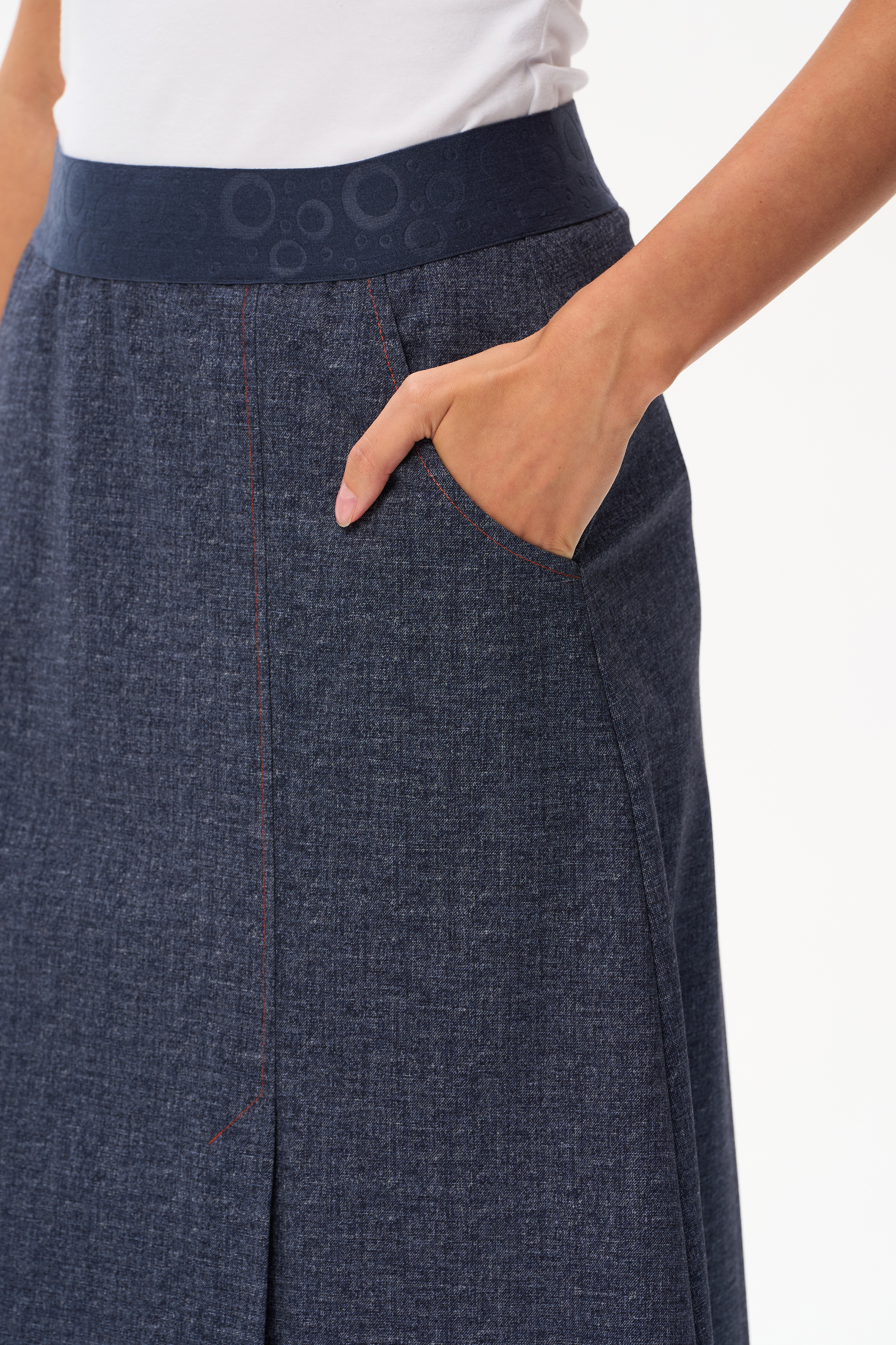 Эффектная юбка А-силуэта из двухстороннего жаккарда, длиной до середины икр, с асимметричным швом спереди и высокой шлицей. Удобные фигурные карманы, пояс с эластичной лентой внутри. Рост модели 175 см.