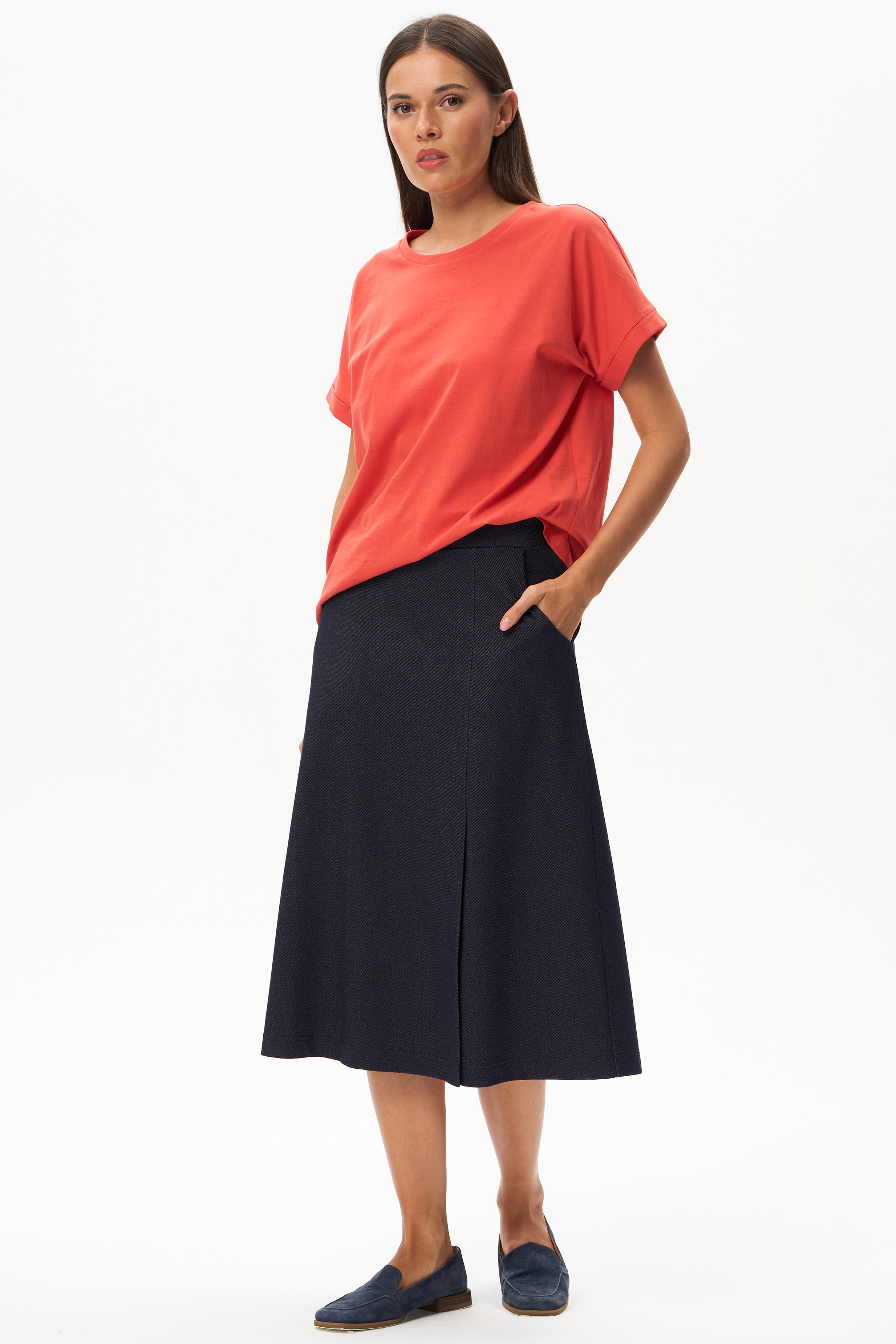 80% хлопок, 14% полиэстер, 6% эластан Эффектная юбка А-силуэта в глубоком синем оттенке, длиной до середины икр, с асимметричным швом спереди и высокой шлицей. Удобные фигурные карманы, пояс с эластичной лентой внутри. Рост модели 175 см