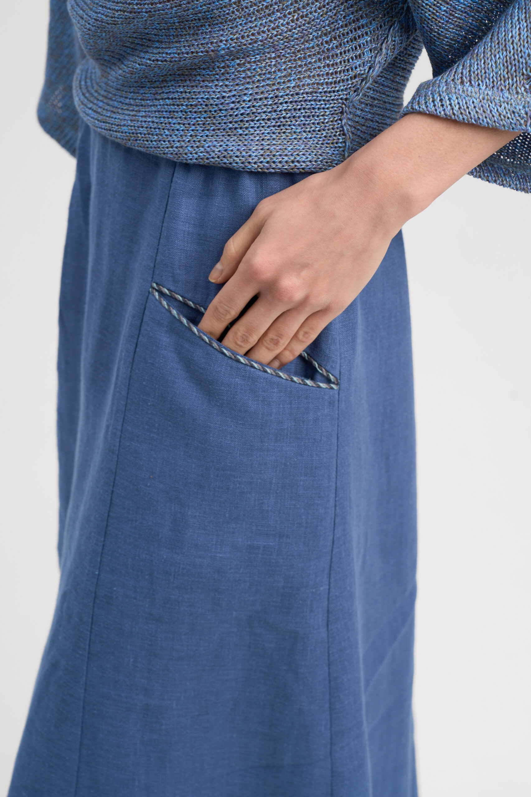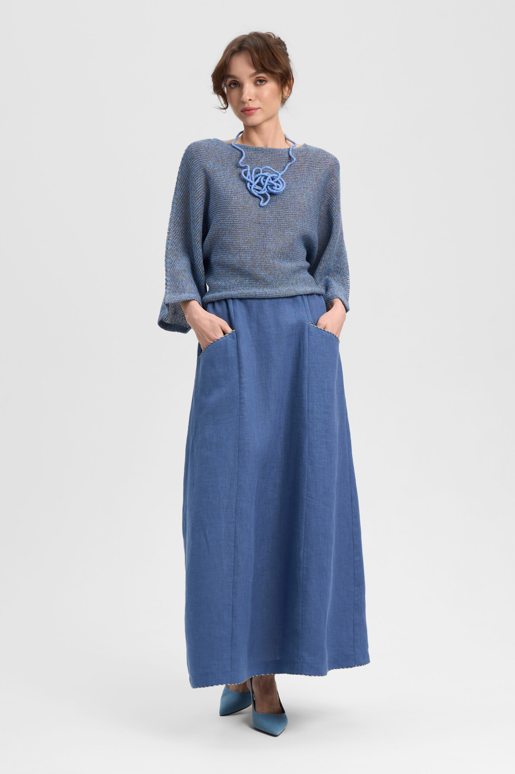 Юбка длинная с рельефами расширенная к низу. Отрезные карманы и низ декорированы шнуром. Пояс цельнокроеный на резинке.