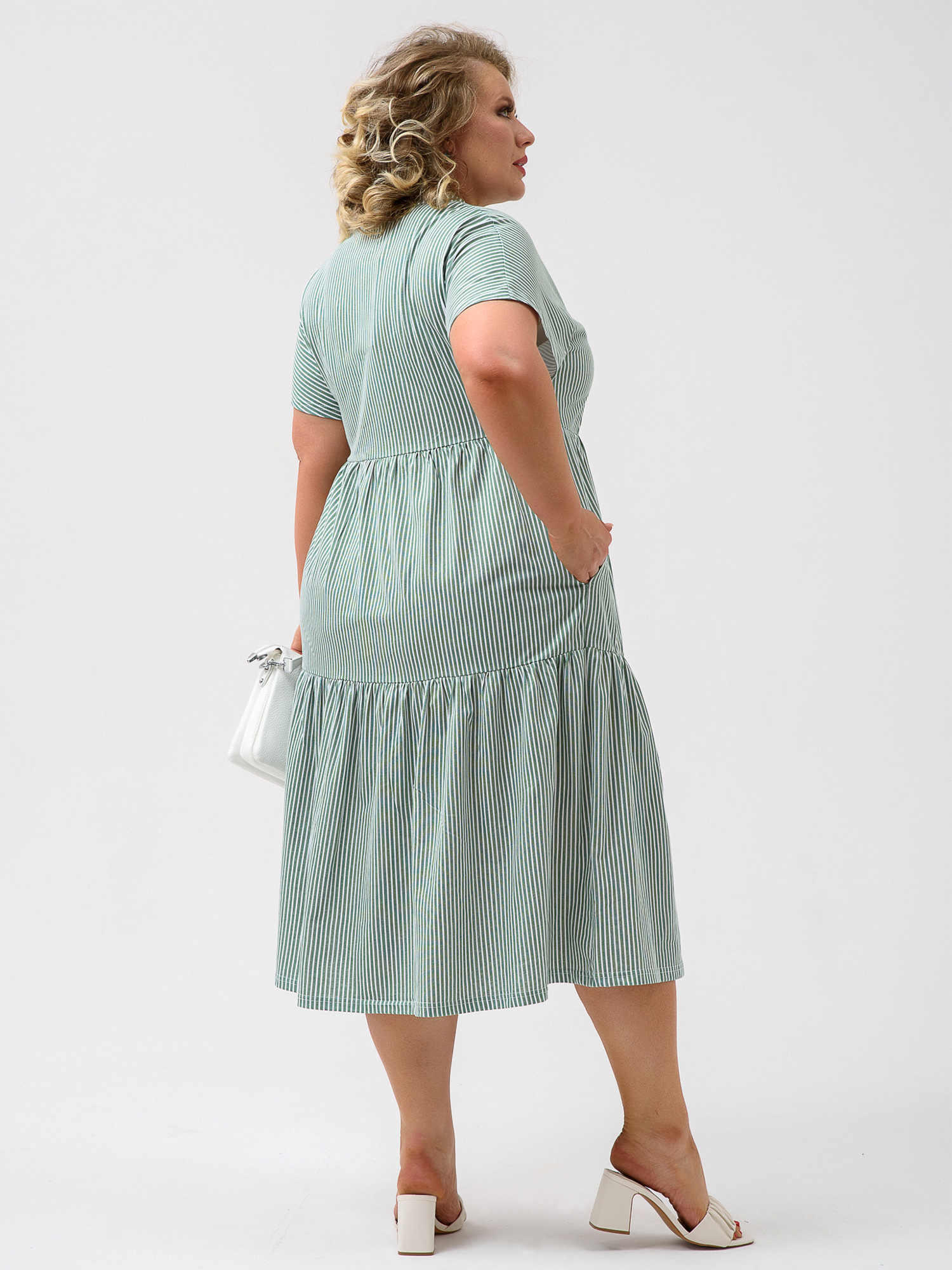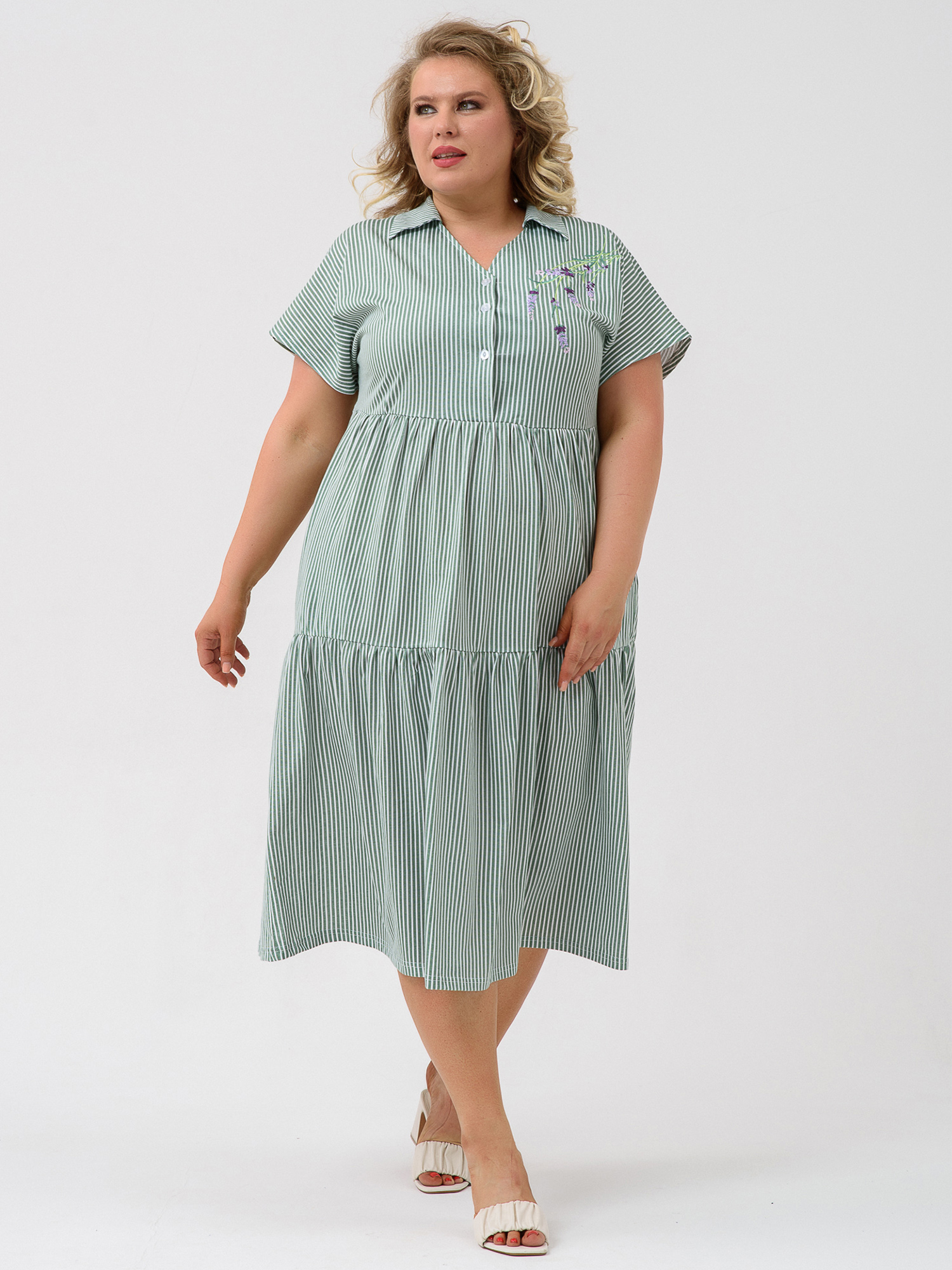 Платье женское из набивного трикотажного х/б полотна. Изделие А-образного силуэта, длиной ниже линии колена. Изделие отрезное с завышенной линией талии и по линии бёдер. Платье с V- образной  формой горловины и отложным воротником с острыми концами, со спущенным цельнокроенным рукавом и застёжкой на петли пуговицы по линии борта. На полочке с левой стороны вышивка. В боковых швах обработаны карманы с фигурной линией входа.