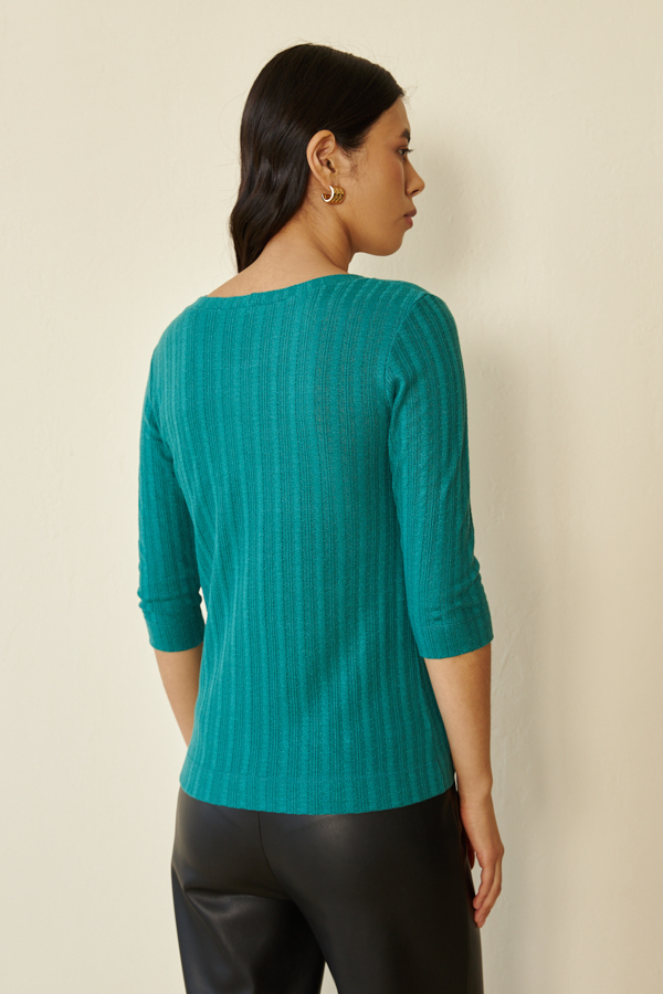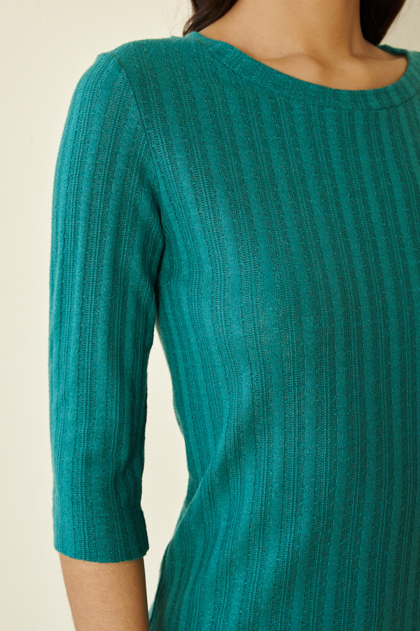 Джемпер прилегающего силуэта из фактурного эластичного полотна. Втачной рукав 3/4. Круглый вырез горловины оформлен бейкой.
