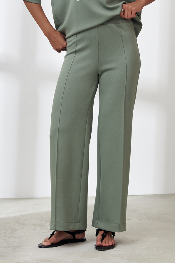 Брюки прямого силуэта из эластичного полотна. Пояс притачной с эластичной резиной. На передней части брюк застрочены стрелки.