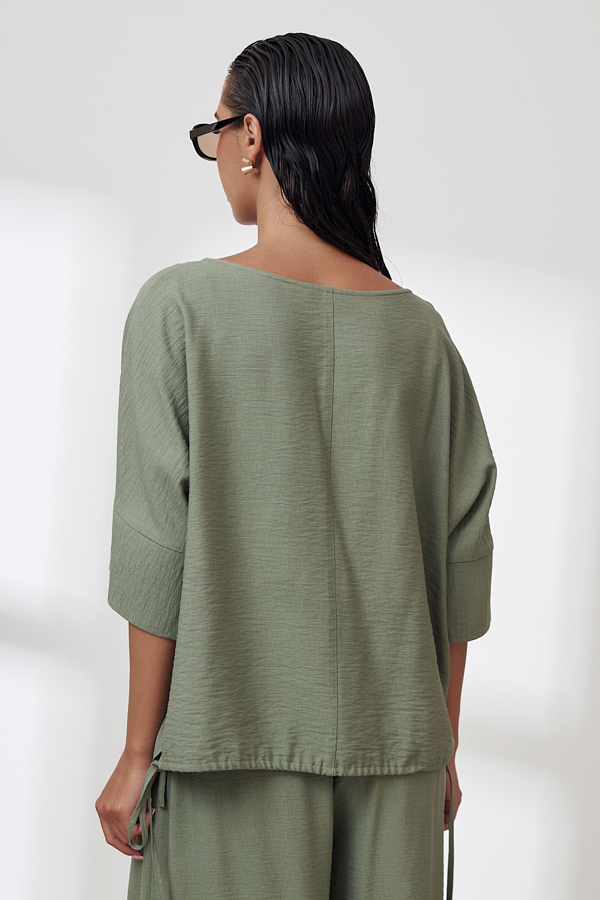 Блуза из вискозной ткани с крэш-эффектом. Очень свободный силуэт с небольшими разрезами по бокам. Круглый вырез горловины. Цельнокроеный рукав с притачной манжетой. Низ изделия затягивается на кулиску.
