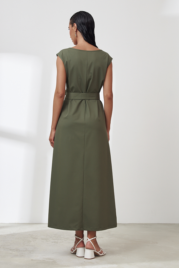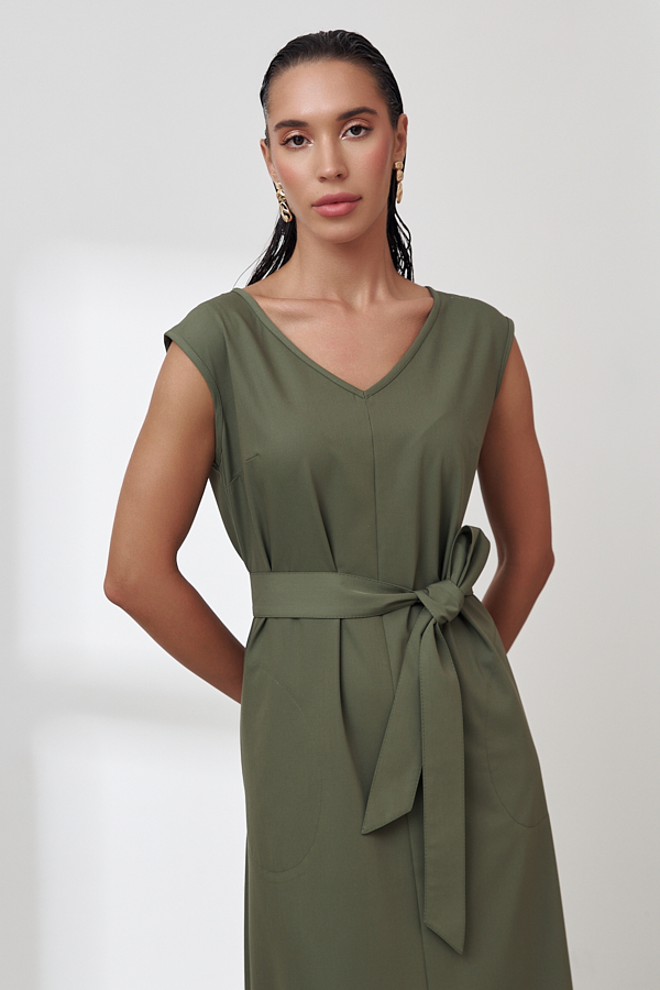 Платье полуприлегающего силуэта, чуть расширенное книзу из вискозной плательной ткани. По центру передней и задней части изделия выполнен шов. V-образный вырез горловины и линия проймы оформлены косыми бейками. Низ изделия асимметричной длины (спинка чуть удлинена относительно переда). В боковых швах карманы с настроченным контуром. В комплекте пояс из основной ткани.