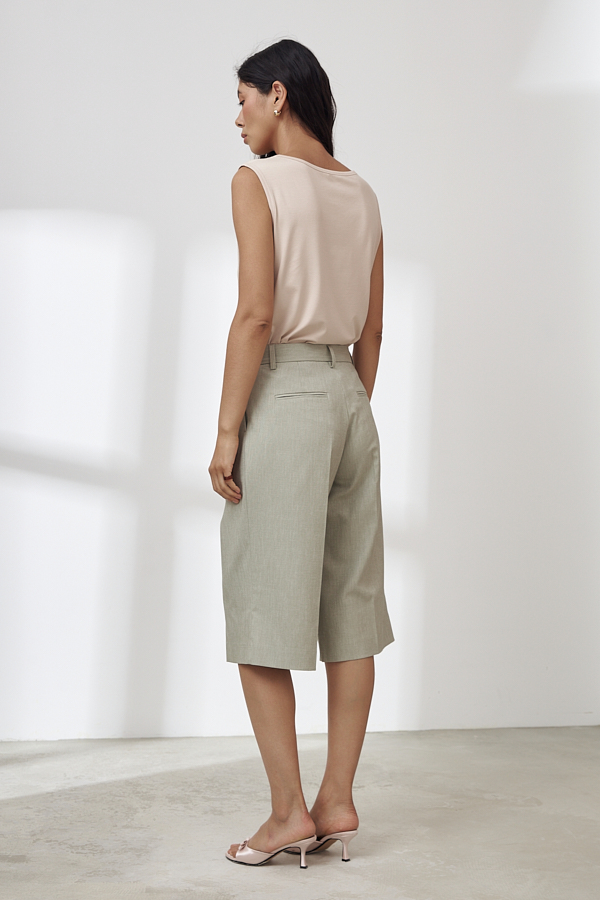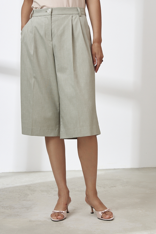 Шорты из меланжевой костюмной ткани свободного силуэта. На передней половинке выполнены карманы с подкройным бочком, по линии талии заложены складки. На задней половинке - талиевые вытачки и имитация карманов в рамку. Притачной пояс со шлёвками. Застёжка на молнию-гульфик и пуговицу.