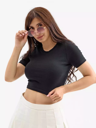 Футболка укороченная женская спортивного стиля, прилегающего силуэта- тренд сезона, выполнена из трикотажного х/б полотна с выработкой «рубчик» . Круглая горловина обработана бейкой из основного материала. Короткий втачной рукав.