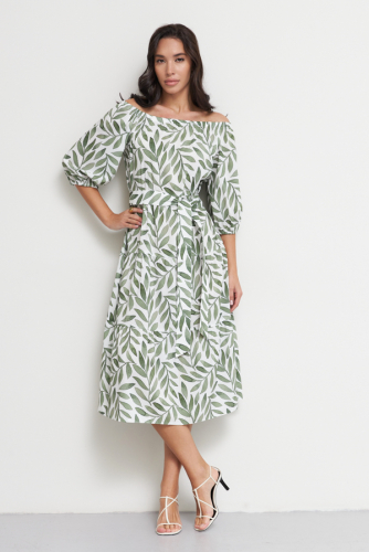 Платье свободного силуэта из плательной ткани, отрезное по линии талии. Нижняя части платья с воланами. Рукав-реглан до локтя. По низу рукава сборка на резину. Линия плеча и линия горловина оформлены сборкой на резину. В комплекте пояс из основной ткани.