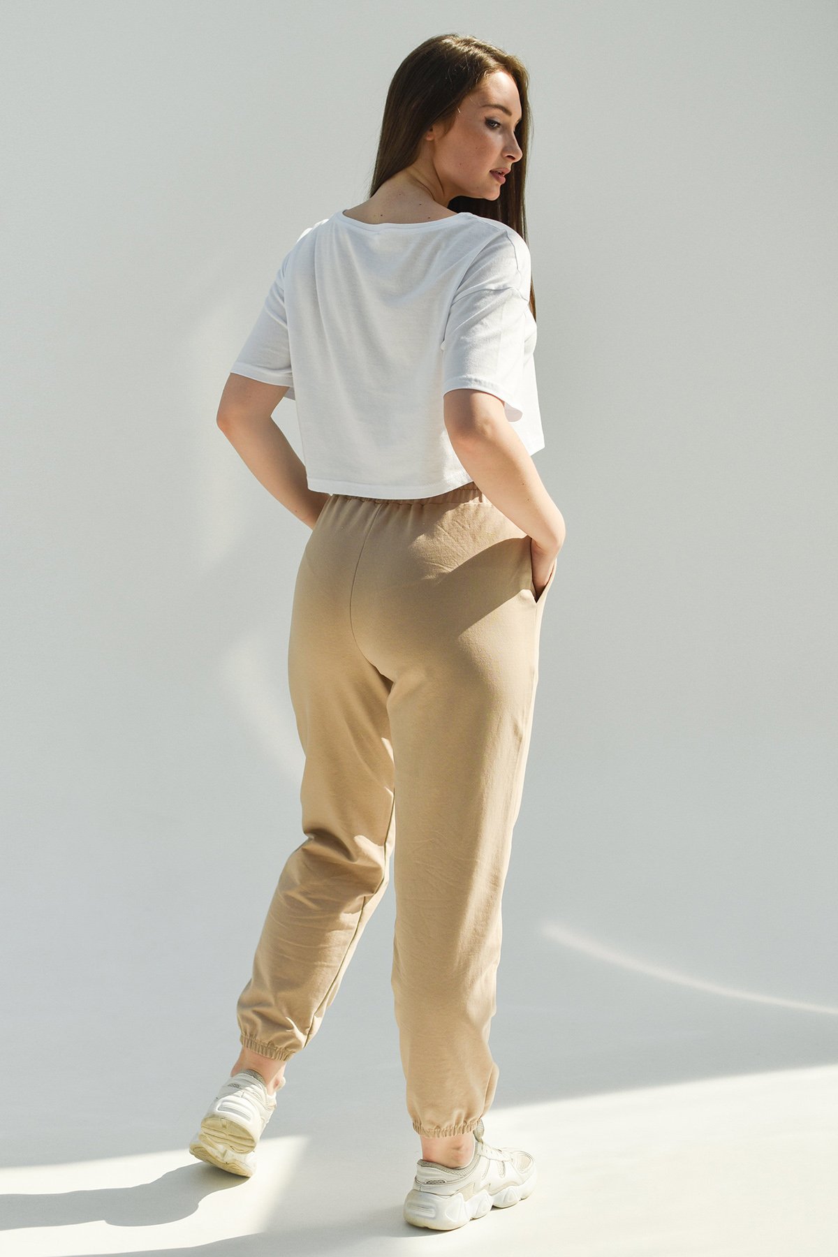 Брюки женские спортивного стиля из гладкокрашенного трикотажного полотна футер с лайкрой. Брюки подойдут девушкам, любящим свободу движения и активный образ жизни, универсальны для дома, прогулок, для спорта и занятий танцами. Широкий отрезной пояс на резинке дополнительно регулируется шнуром. Удобные карманы с отрезным бочком. Низ брюк на резинке.