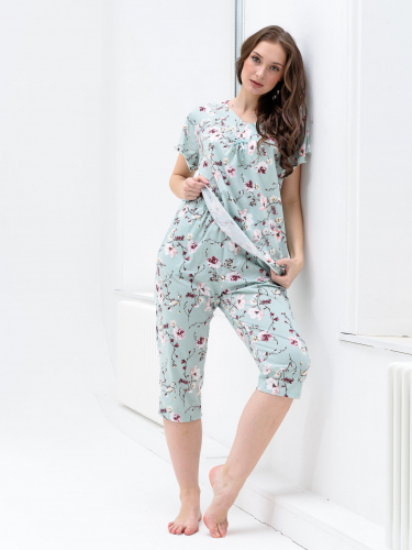 Пижама женская из набивного полотна состоит из футболки и бридж. Футболка прямого силуэта с коротким рукавом-реглан. «V»-образная горловина полочки обработана обтачкой, горловина спинки окантована бейкой из основного полотна. Низ изделия обработан швом «в подгибку», низ рукавов – краеобмёточной машиной. Бриджи прилегающего силуэта с боковыми карманами в швах. Пояс цельнокроеный на резинке.