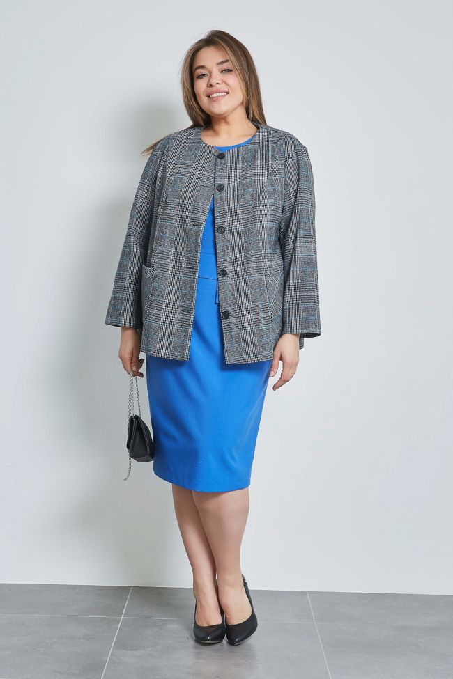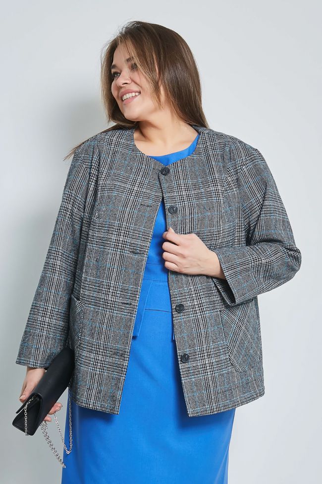 серый Деловой жакет из костюмной ткани в клетку без подклада,  длиной за линюю бедра. Втачной рукав длиной 7/8  согреет в прохладную погоду. У жакета круглая горловина и центральная застежка на петли пуговицы. Модель с накладными карманами. Низ ровный. Жакет станет отличным дополнением как делового, так и повседневного гардероба.