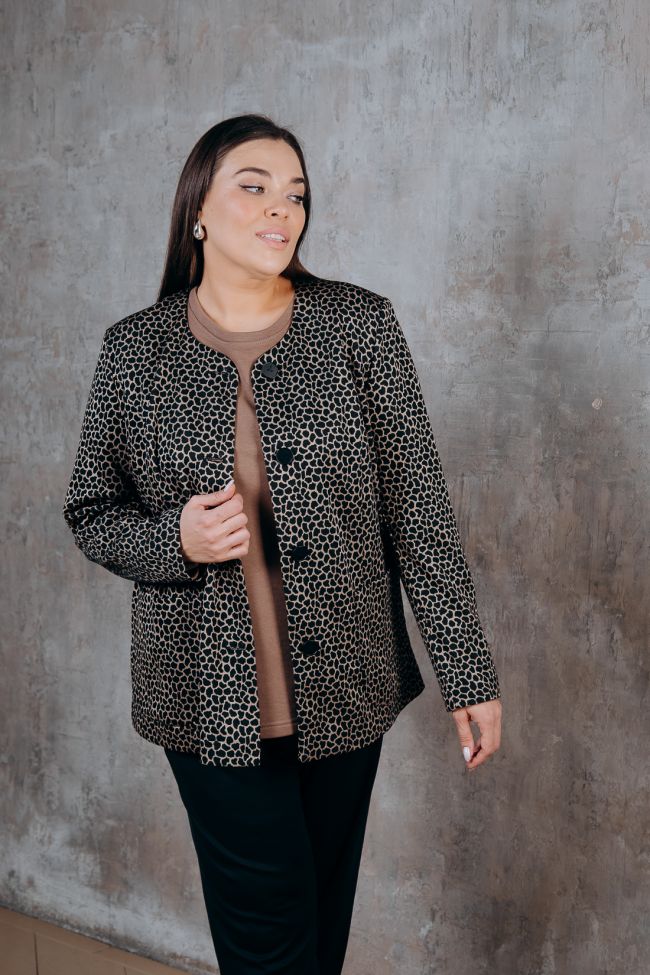 коричневый Жакет из плотной трикотажной ткани без подклада длиной за линюю бедра. Прилегание по фигуре за счет вертикальных рельефов. Длинный втачной рукав. Круглый вырез горловины и центральная застёжка на петли пуговицы. Модель с большими накладными карманами. Жакет станет отличным дополнением как офисного, так и повседневного гардероба. Замечательный выбор для стильных образов.