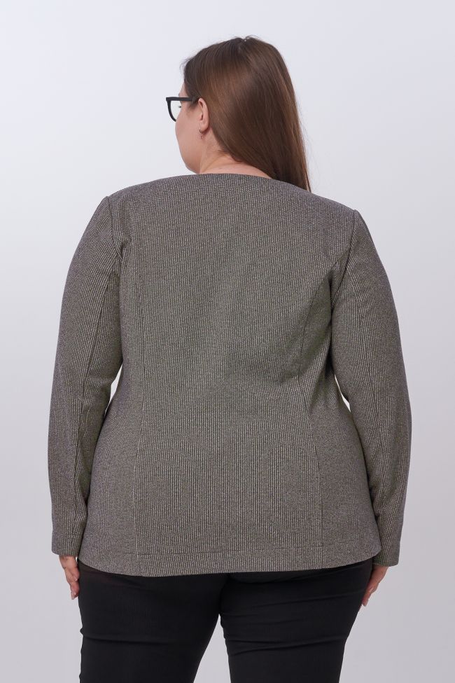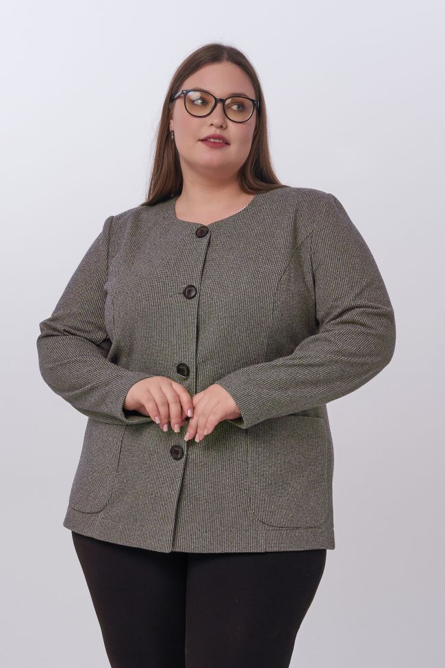 коричневый Деловой жакет из костюмной ткани в клетку длиной за линюю бедра без подклада. Прилегание по фигуре за счет вертикальных рельефов. Длинный втачной рукав. Круглый вырез горловины и центральная застёжка на петли пуговицы. Модель с большими накладными карманами. Жакет станет отличным дополнением как офисного, так и повседневного гардероба. Замечательный выбор для стильных образов.