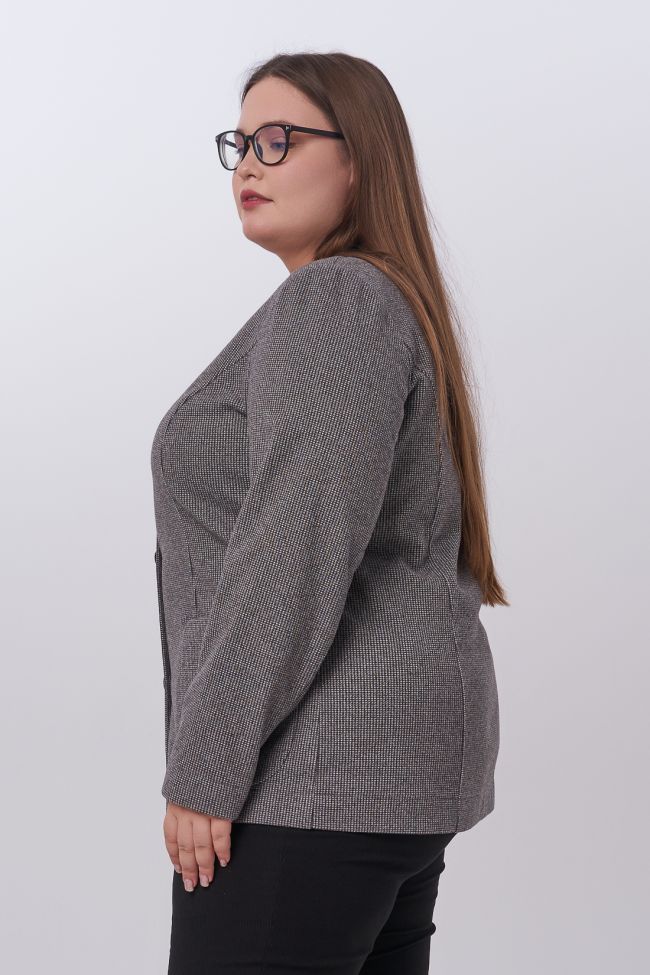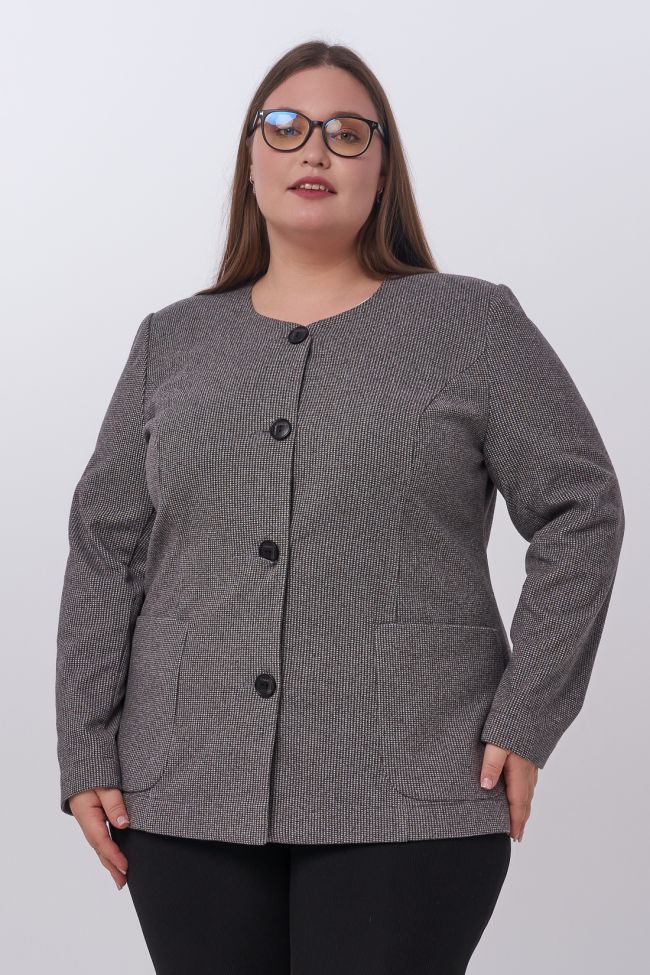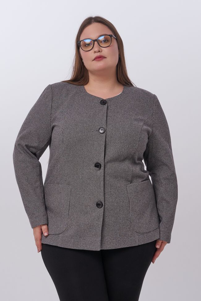 серый Деловой жакет из костюмной ткани в клетку длиной за линюю бедра без подклада. Прилегание по фигуре за счет вертикальных рельефов. Длинный втачной рукав. Круглый вырез горловины и центральная застёжка на петли пуговицы. Модель с большими накладными карманами. Жакет станет отличным дополнением как офисного, так и повседневного гардероба. Замечательный выбор для стильных образов.