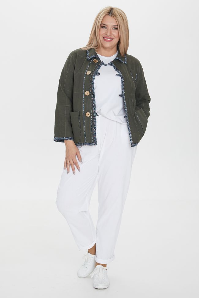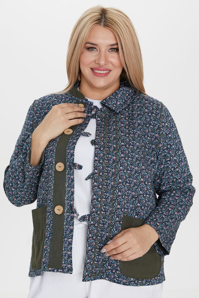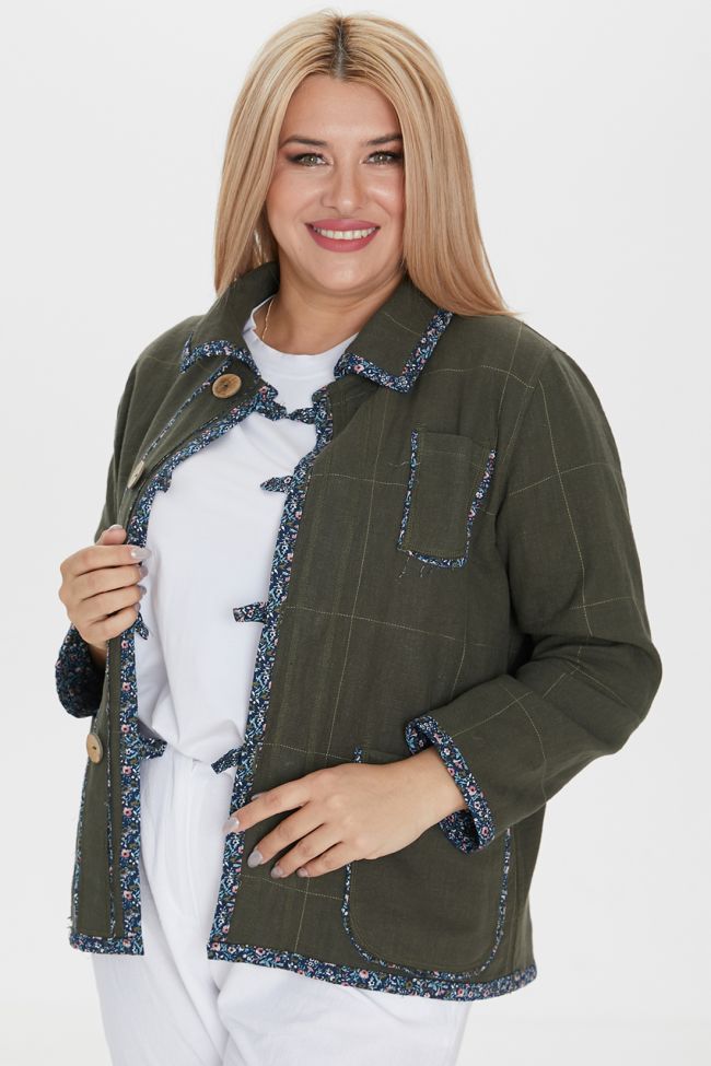 зеленый Стильный, двусторонний льняной жакет полуприлегающего силуэта, укороченной длины. Модель с центральной застежкой на навесные петли и пуговицы. Горловина оформлена отложным воротником. По переду слева нагрудный карман и 2 накладных кармана ниже уровня талии. Одна сторона жакета выполнена из однотонной ткани с принтованной отделкой в виде канта по карманам и окантовки воротника, низа рукавов, борта и низа изделия. Вторая сторона в принт, с однотонными карманами и планкой, подкладка: 100% хлопок. Низ ровный. Яркий жакет украсит гардероб любой модницы.