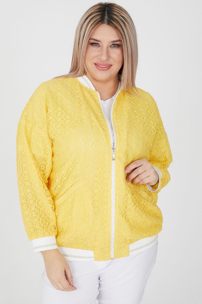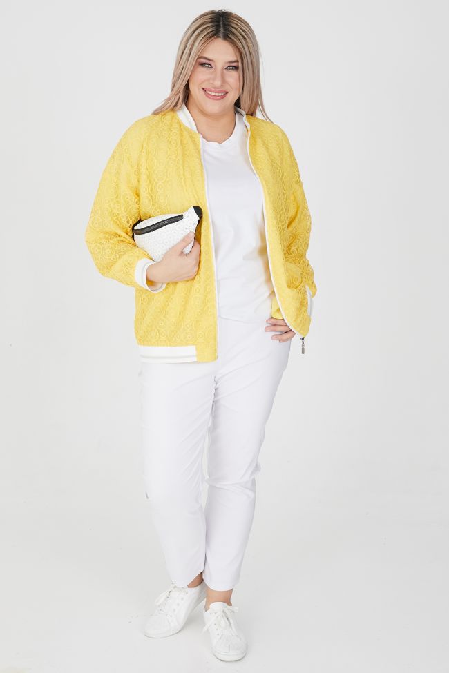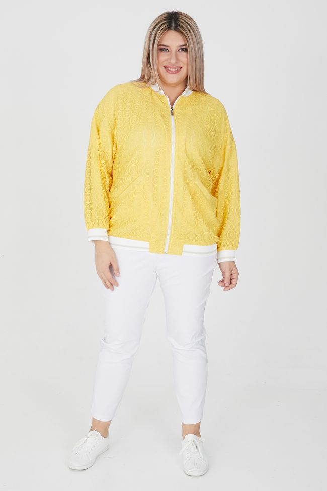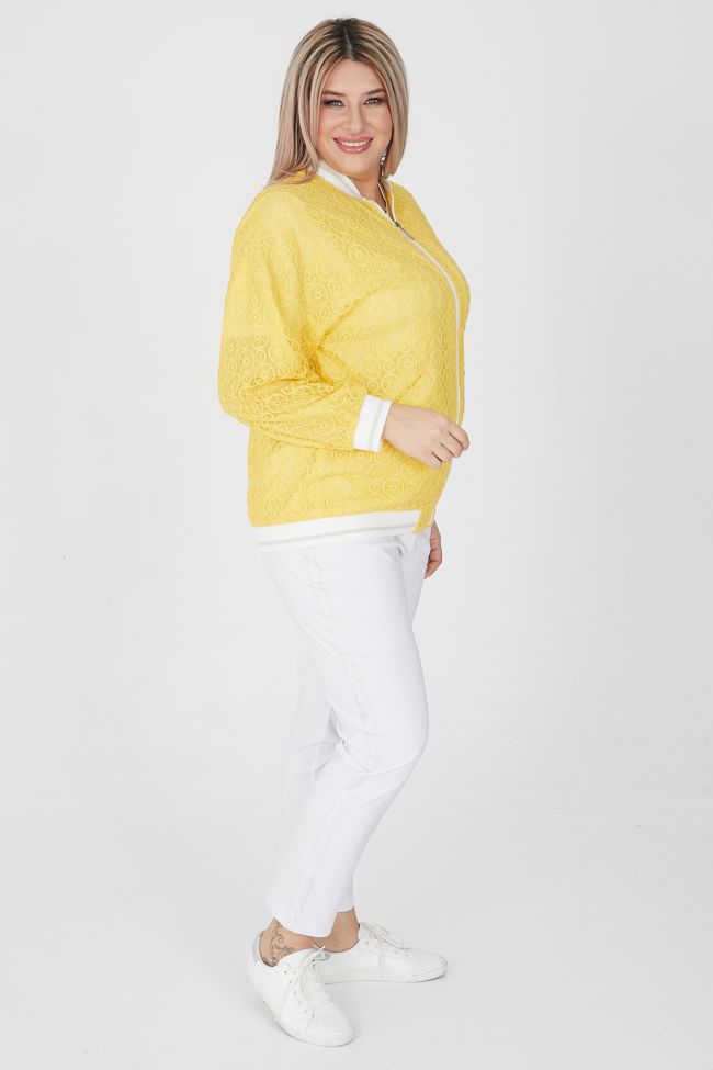 желтый Яркий жакет прилегающего силуэта из кружевного  полотна на подкладке из шифона. Круглый вырез горловины с воротником - стойка. В виде отделки: по манжетам рукава, воротнику и низу изделия - подвязы. Длинные рубашечные рукава на спущенной пройме оканчиваются эластичными манжетами. Модель с центральной застежкой на тесьму - молнию. По переду прорезные наклонные карманы с листочкой. Стильный жакет станет отличным дополнением элегантных комплектов одежды, а яркий цвет подарит солнечное настроение на весь день!