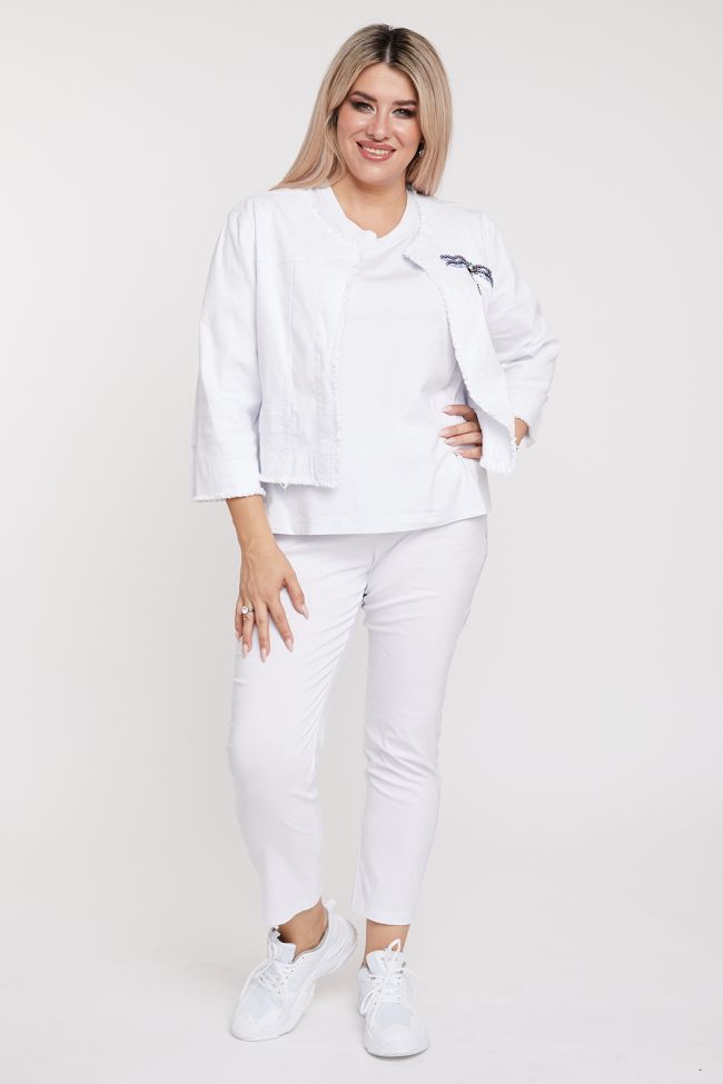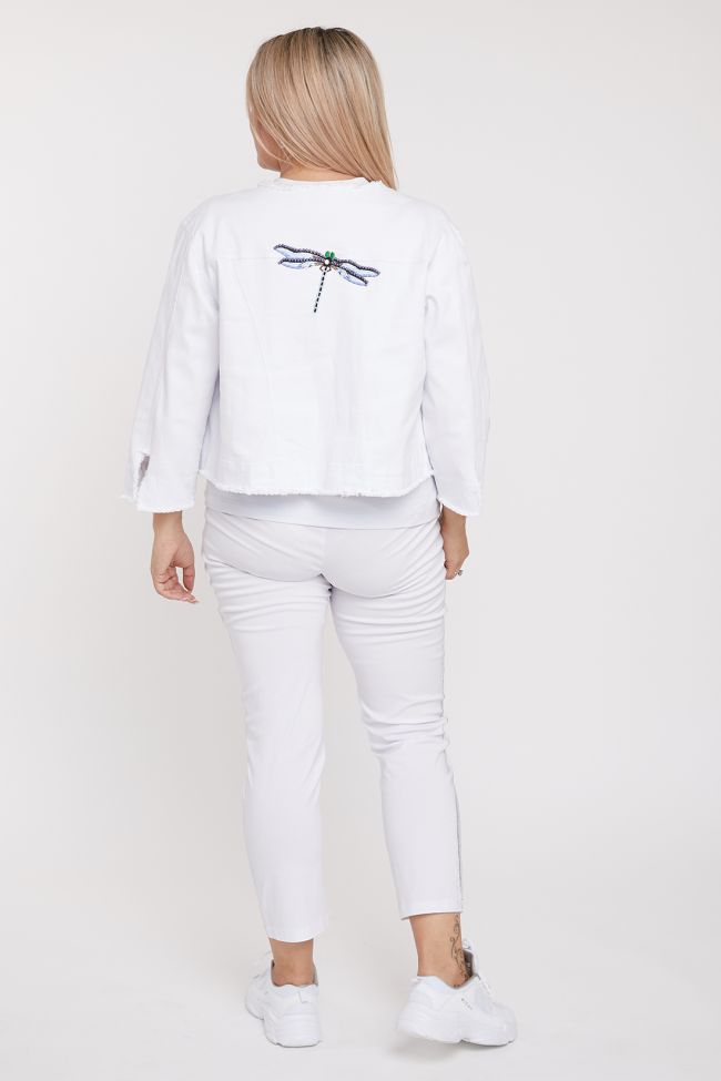 белый Стильный джинсовый жакет полуприлегающего силуэта, укороченной длины. Модель без застежки. Перед и спинка с вертикальными рельефами и горизонтальной кокеткой. По переду прорезные карманы-обманки с листочкой. Рукава втачные двухшовные, длиной 7/8, дополнены разрезами в швах. Низ ровный. Изюминкой модели является оригинальная вышивка - стрекоза, украшенная бусинами и отделка бахромой по борту, горловине, низу и рукавам.