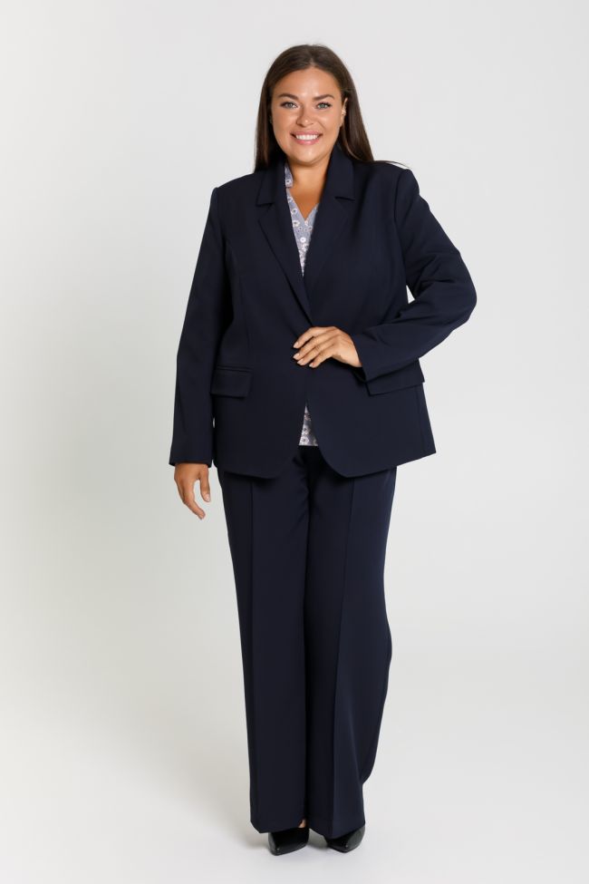синий Стильный жакет полуприлегающего силуэта из костюмной ткани "Барби босс", с подкладом, длиной за линию бедер.  V-образная горловина с отложным воротником. Модель с центральной застежкой на петли-пуговицы. Втачные длинные рукава. Прилегание по фигуре за счет вертикальных рельефов переда и спинки. По переду удобные прорезные карманы в рамку. Низ ровный. Жакет станет отличным дополнением как делового, так и повседневного гардероба.  Жакету гармоничный комплект составят брюки 1401 и 1352