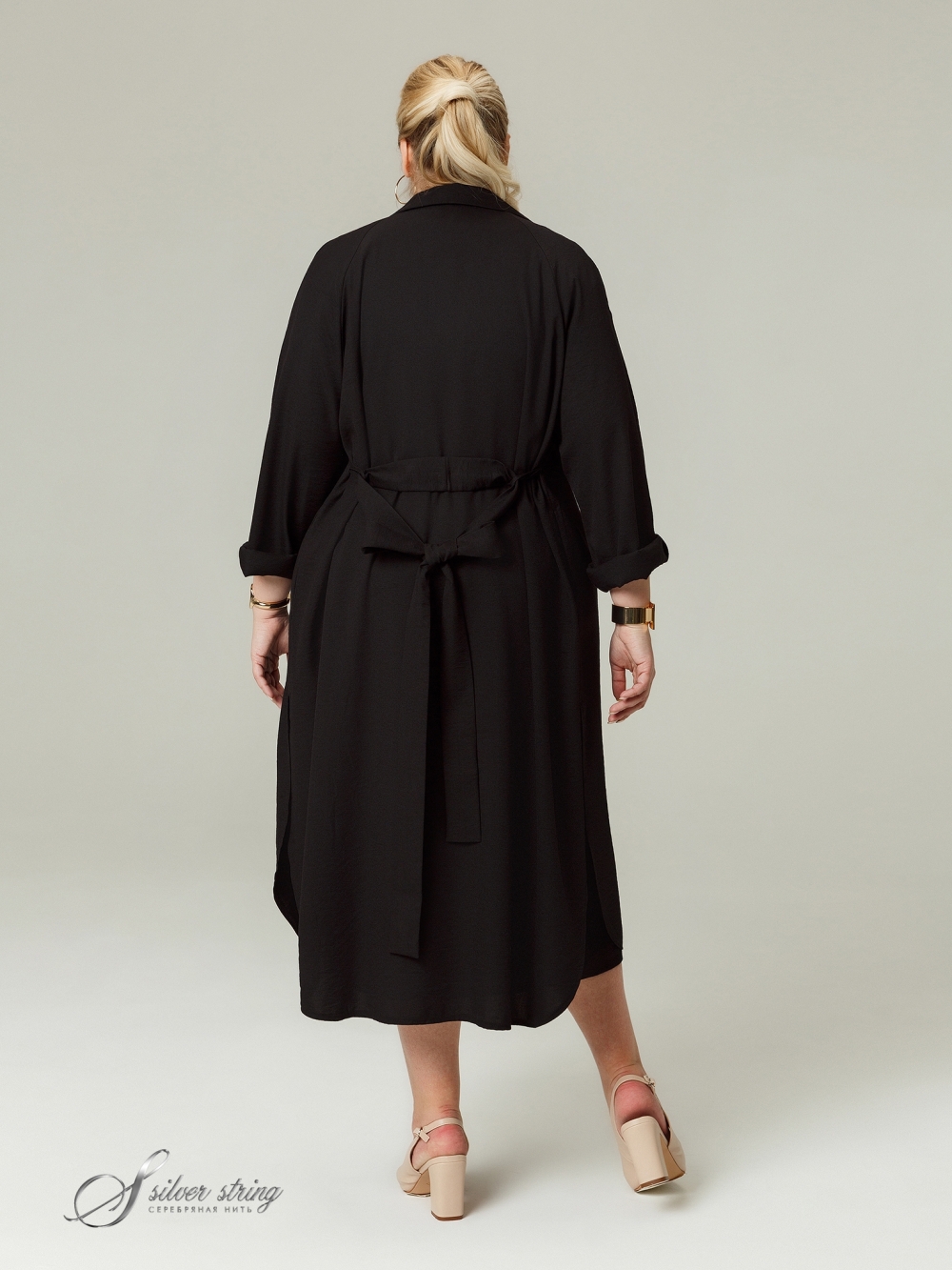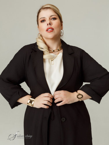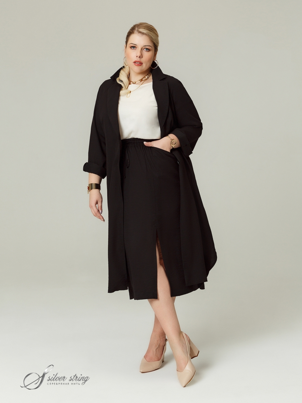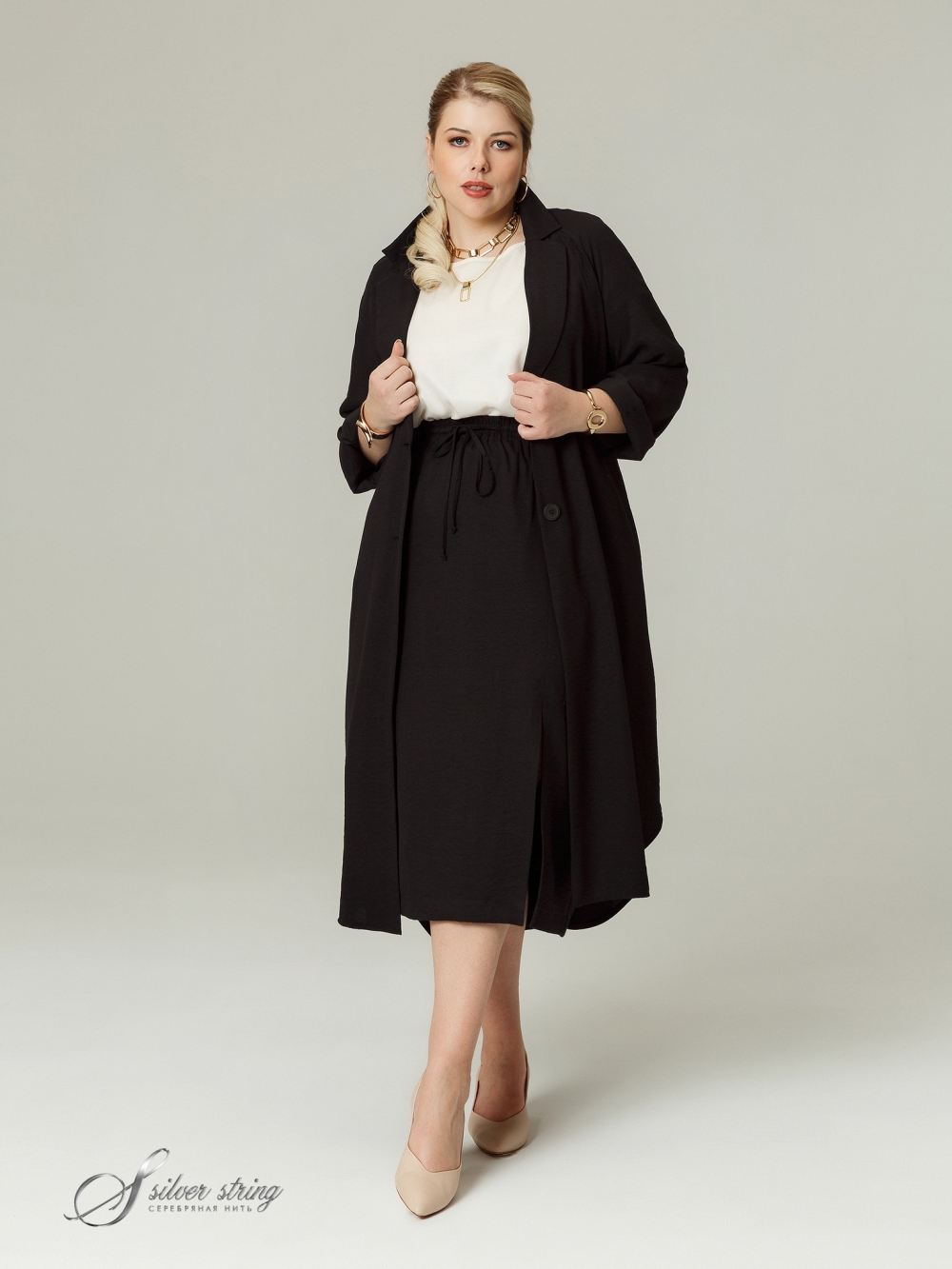 Удлиненный жакет - «шазюбль» прямого силуэта выполнен из фактурной смесовой ткани с большим содержанием натурального волокна. Модель с английским воротником на углубленной горловине и застежкой на крупные пуговицы. Рукав длинный, покроя реглан. Низ рукава можно носить «на отворот»: тем самым регулировать его длину по своему усмотрению. Изделие с удобными карманами в швах и съемным поясом. Линия низа асимметричной формы: спинка значительно удлинена относительно полочки. В боковых швах обработаны высокие скругленные разрезы. Один из главных плюсов шазюбля — его универсальность, отличная способность сочетаться с вещами в разнообразных стилях и дополнять разные комплекты. Шазюбль можно носить с брюками, юбками, платьями; с длинными и короткими вещами, с классической, спортивной и одеждой в стиле «Casual». Второй плюс — способность создавать вертикаль и вытягивать фигуру, скрывая недостатки и добавляя стройности.