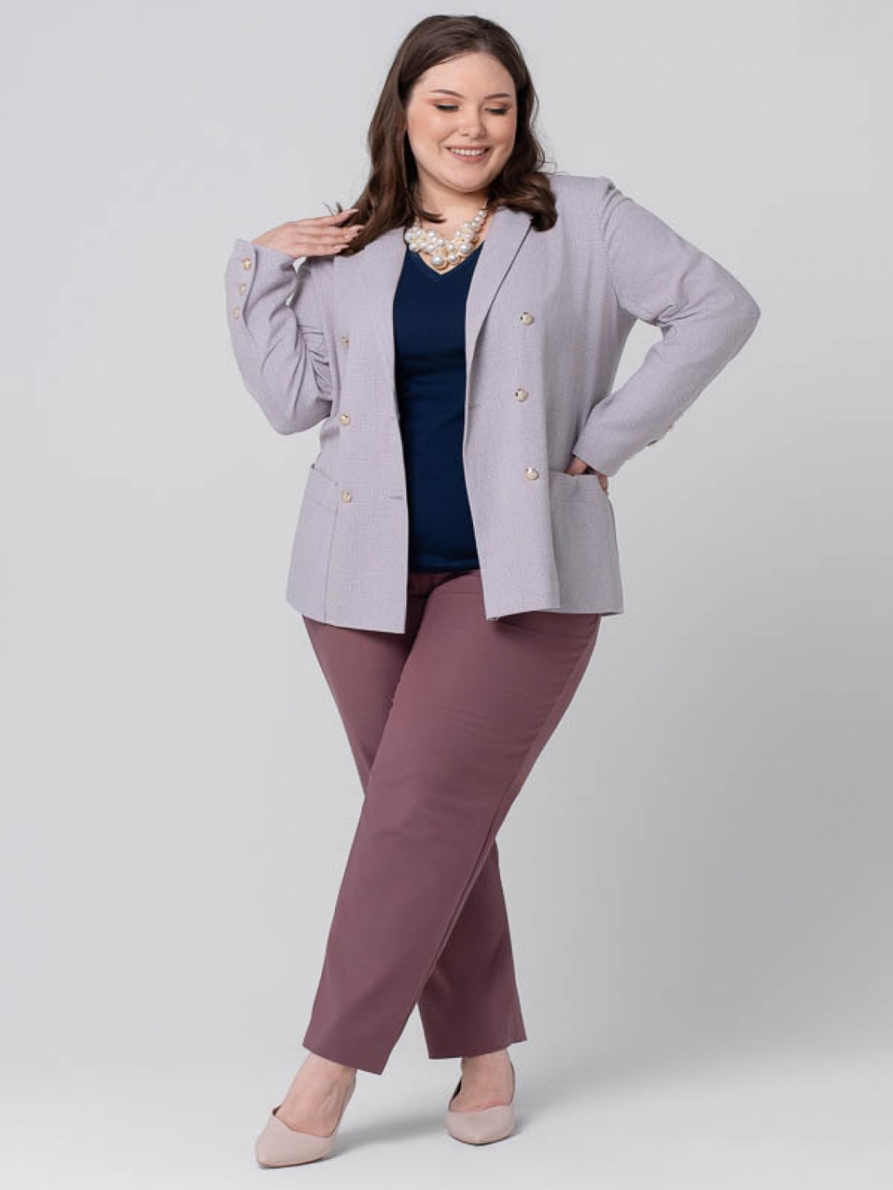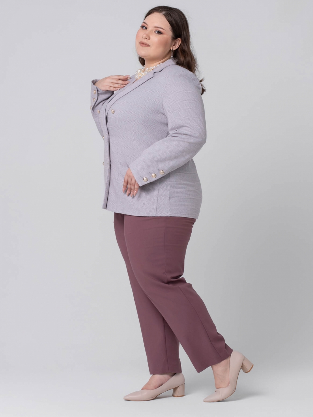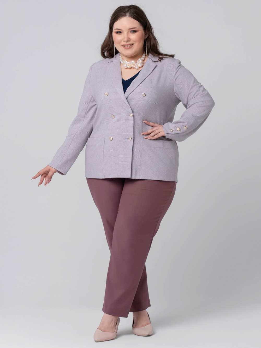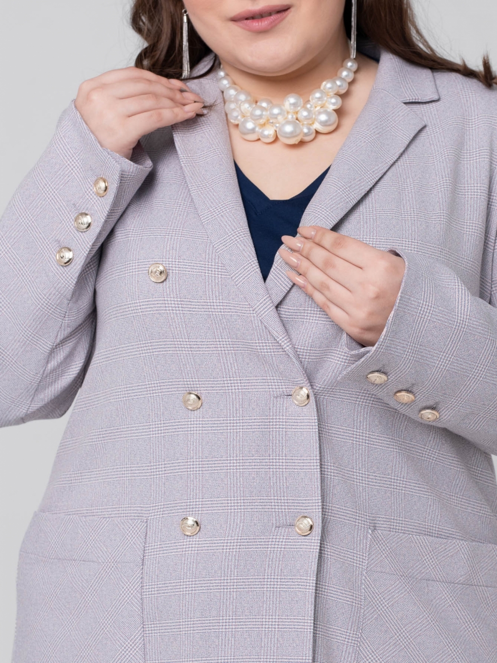 Мягкий классический жакет прямого силуэта в стиле Casual, выполнен из эластичной смесовой ткани в клетку. Модель с длинным втачным рукавом и английским воротником на углубленной горловине. Застежка двубортная на эффектные металлизированные пуговицы. На аналогичные пуговицы застегиваются высокие шлицы на рукавах. На полочке расположены накладные карманы, где рисунок расположен под углом 45 градусов. Модель прекрасно комплектуется с мягкими широкими брюками. Брючный костюм такого кроя всегда выглядит очень элегантным и выгодно подчеркнет женский силуэт и завуалирует возможные недостатки.