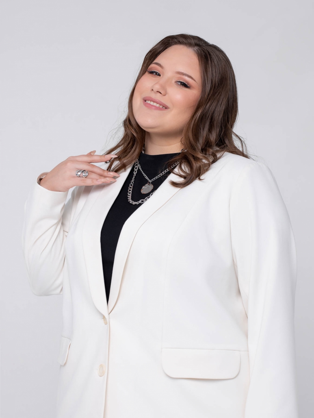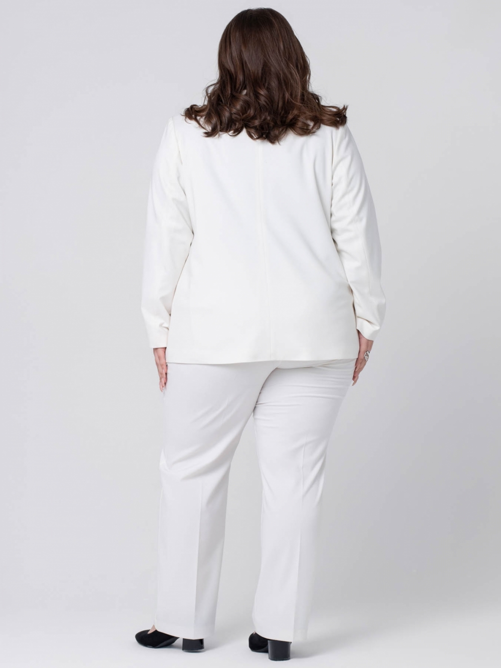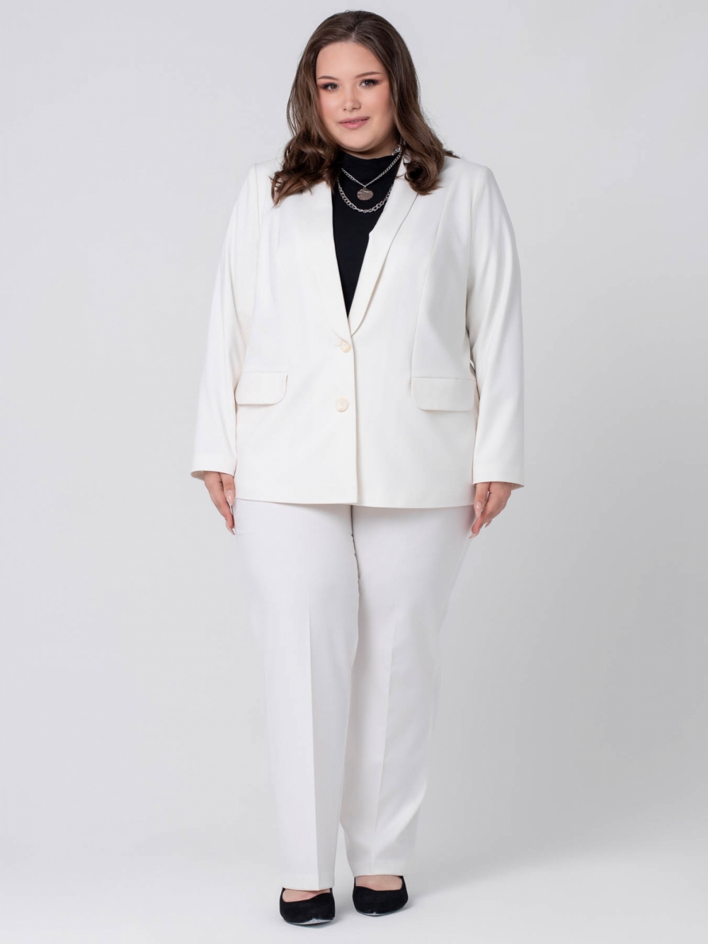 Элегантный жакет прямого силуэта выполнен из эластичной, смесовой ткани. С внутренней стороны изделие полностью обработано подкладкой. Модель с шалевым воротником на углубленной й горловине и застежкой на пуговицы в цвет ткани. Рукав втачной , длинный. На полочке расположены прорезные карманы с клапаном. Это элегантная модель изумительного кремового оттенка отлично подойдет для создания разнообразных ансамблей. Жакет прекрасно комплектуется с мягкими широкими брюками. Подобный брючный костюм всегда выглядит очень элегантно , а нежный цвет обладает притягательностью и заряжает оптимизмом. Особенно в зимний период, когда всем не хватает света и тепла.