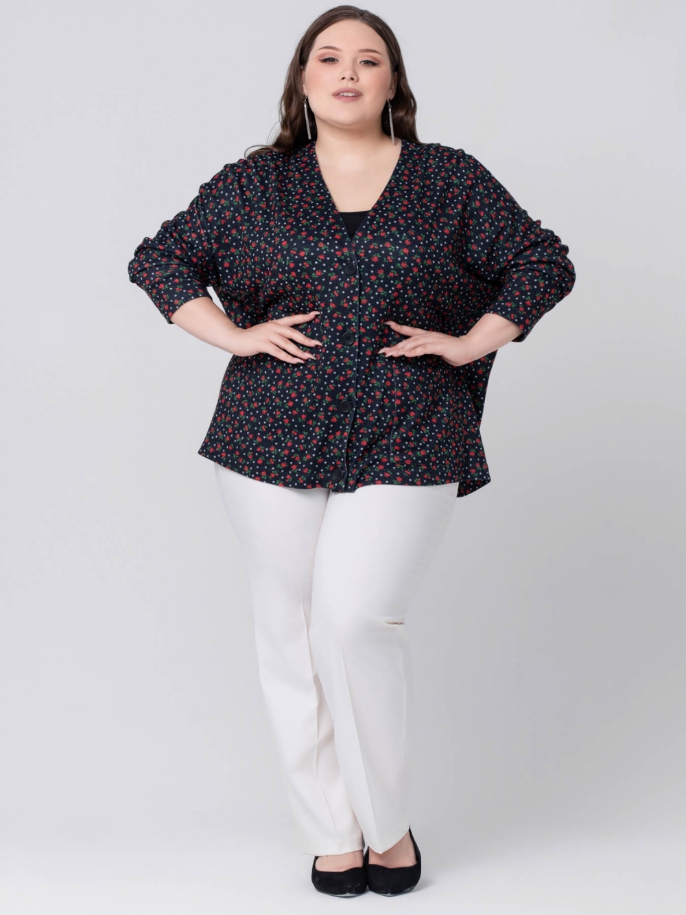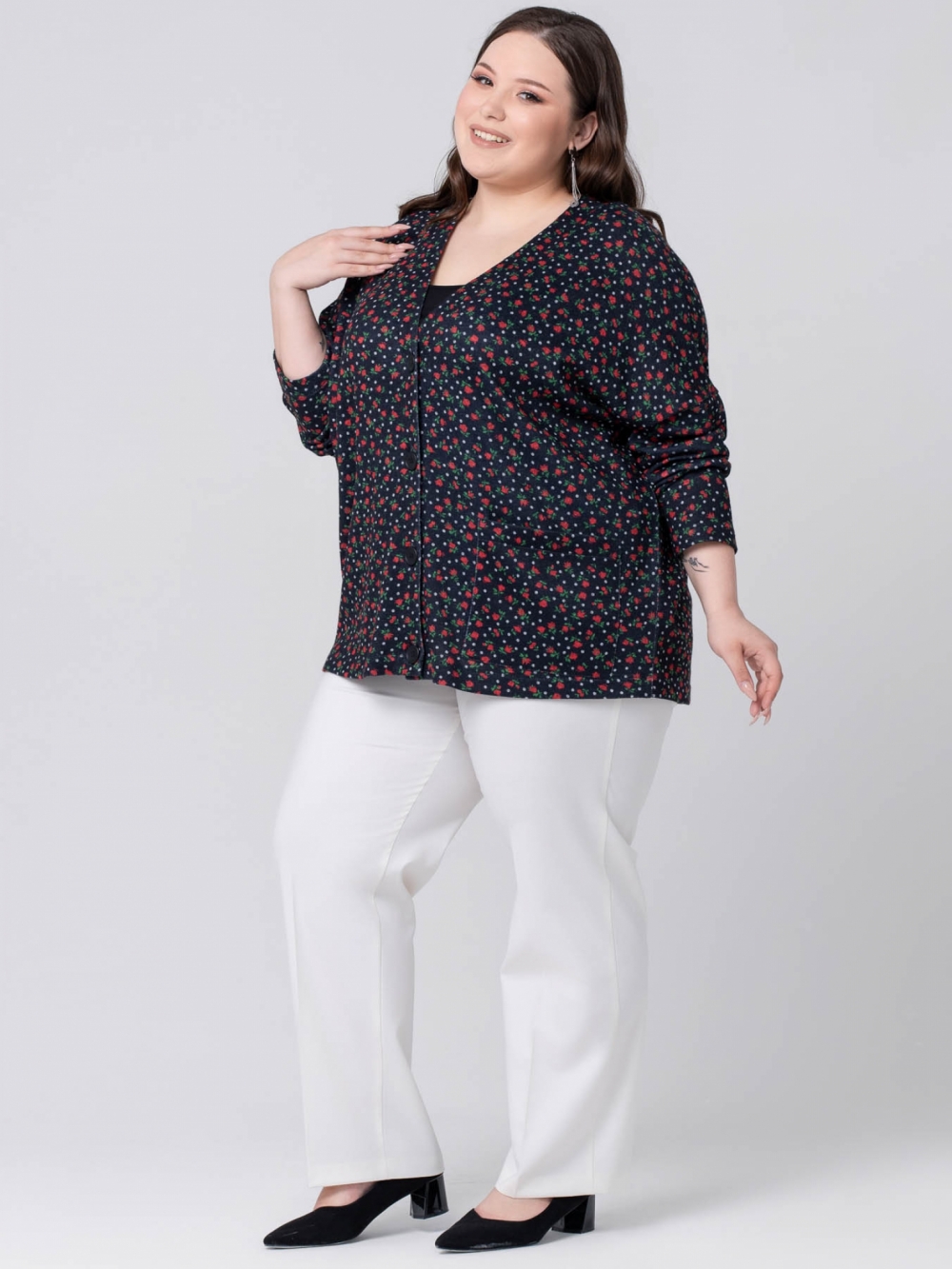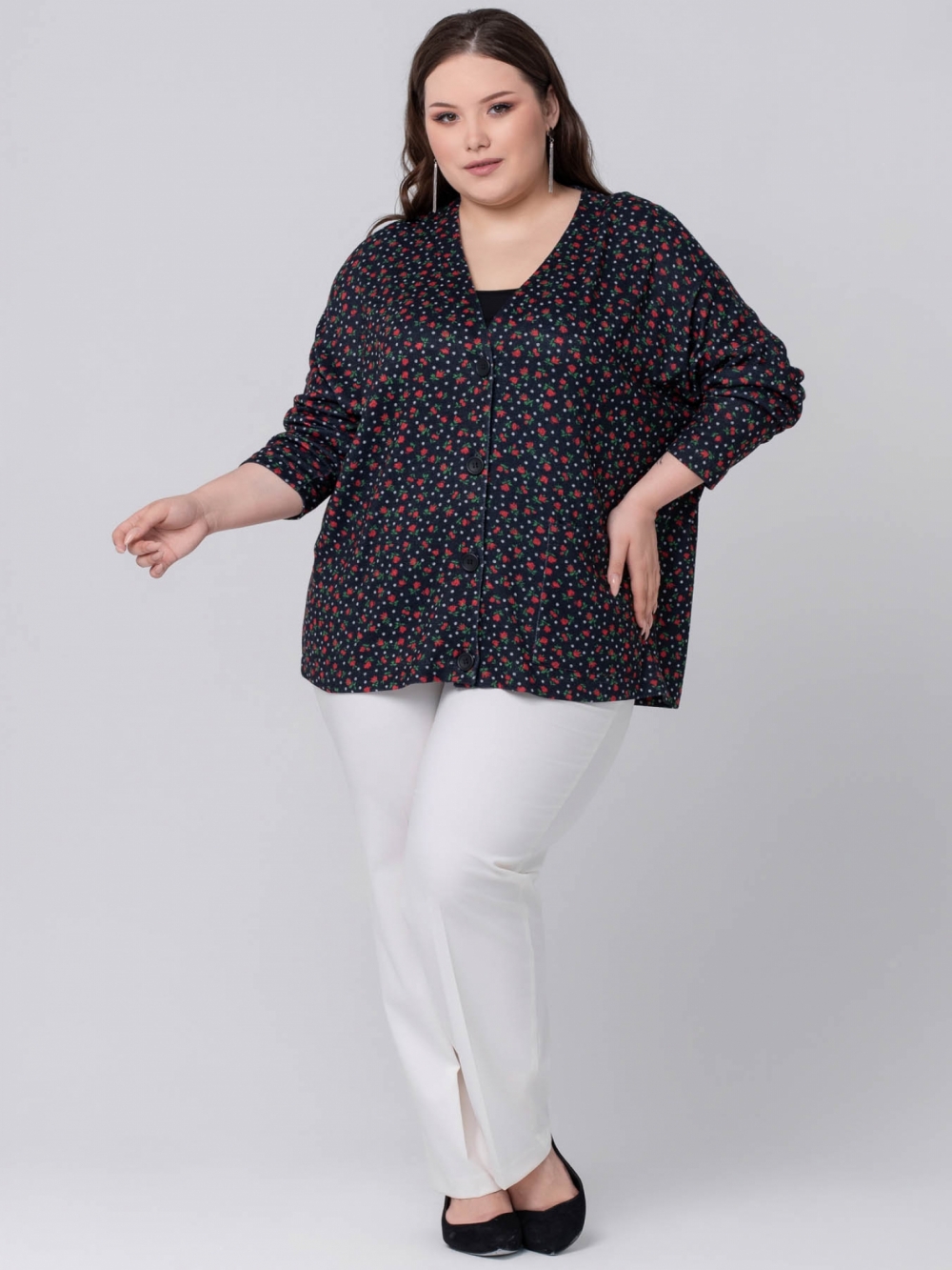 Стильный жакет-кардиган свободного силуэта, с удлиненной линией плеча, выполнен из мягкого трикотажного полотна с цветочным рисунком. Модель с углубленной У-образной линией горловины и застежкой на пуговицы в тон ткани. Рукав длинный, суженный к низу. На левой стороне полочки настрочен крупный накладной карман с фирменной нашивкой логотипом. Модель отлично сочетается с вещами в разнообразных стилях, скрывая проблемные зоны, придает ощущение свободы и комфорта.