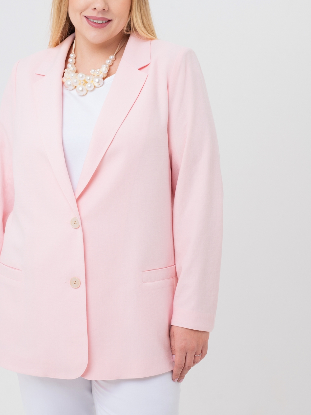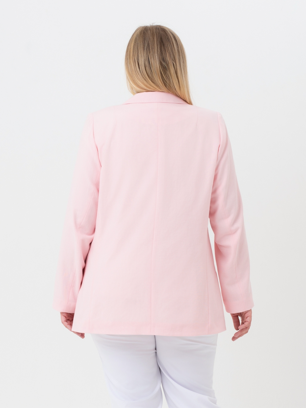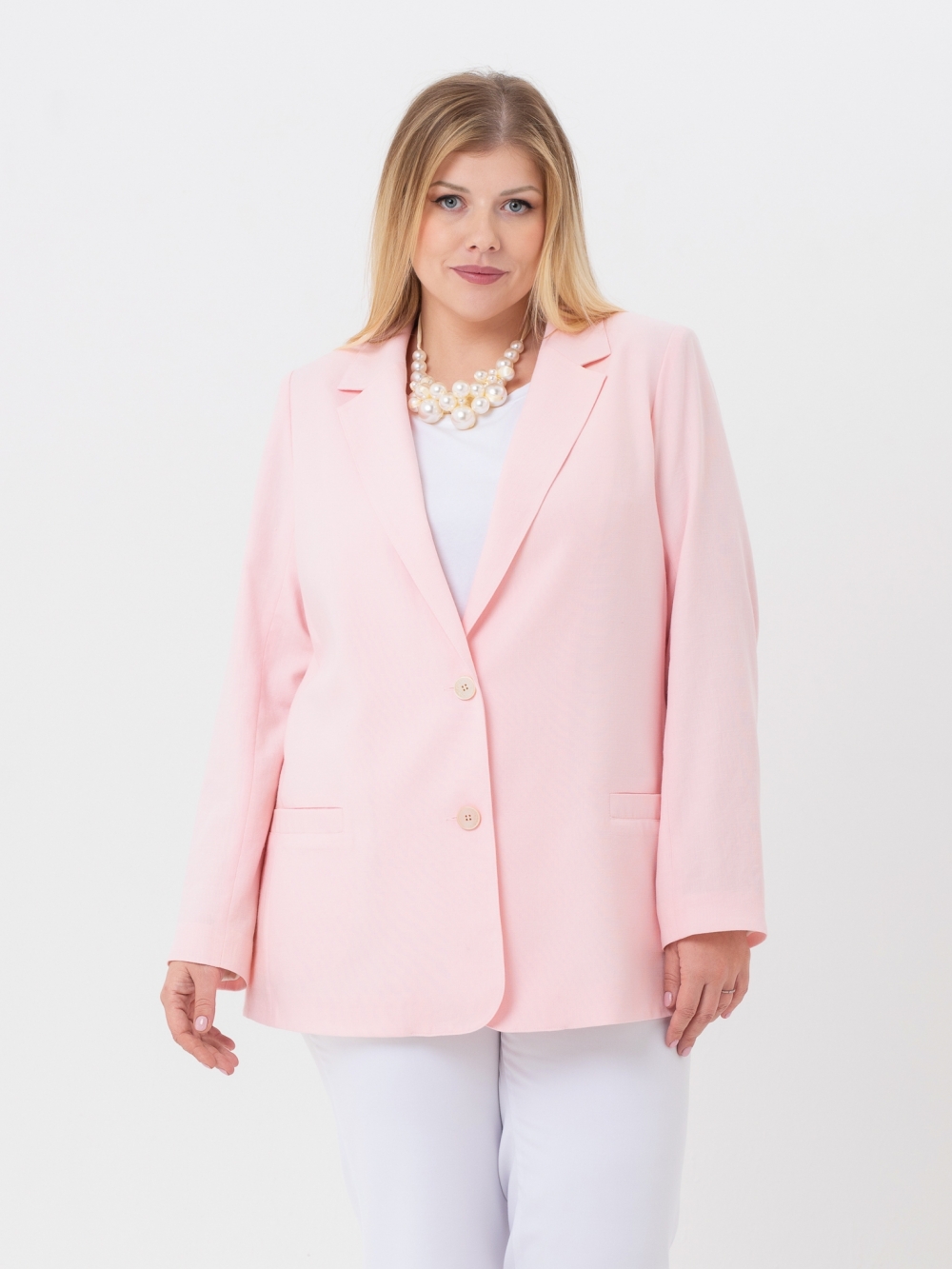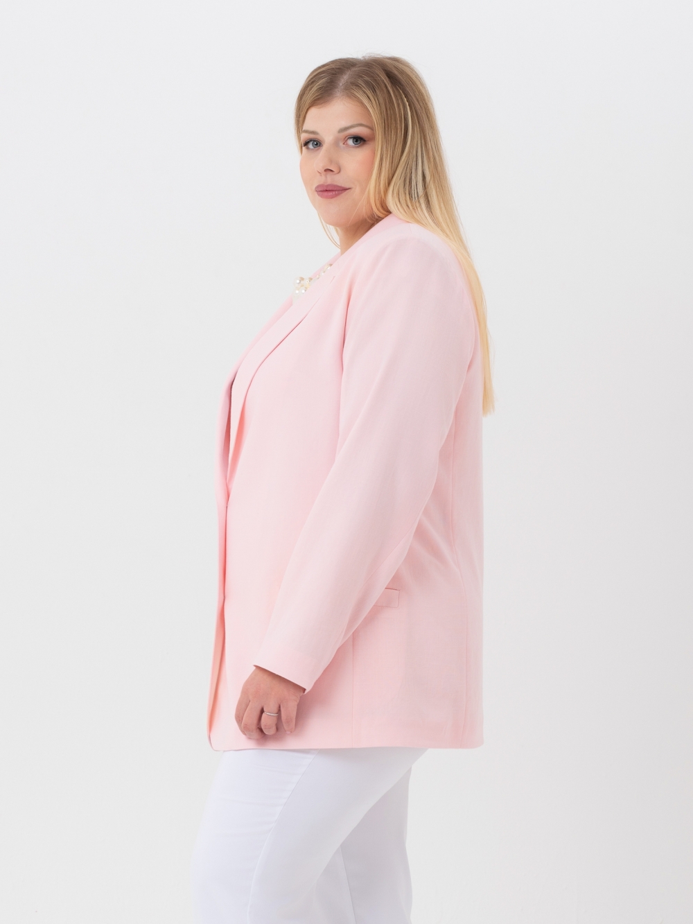 Классический жакет с английским воротником на углубленной горловине выполнен из однотонной гладкокрашеной ткани с высоким содержанием натурального волокна. Модель обработана подкладкой контрастного цвета, в цвет подкладки подобраны пуговицы. Жакет прямого силуэта, с длинным втачным рукавом. Край борта скруглен к низу. На полочке расположены прорезные карманы с листочкой. Нежный, пастельный цвет изделия пропитан летним настроением. Жакет выглядит очень элегантно и выгодно подчеркнет женский силуэт. Секрет заключается в идеальных лекалах и отличном исполнении.