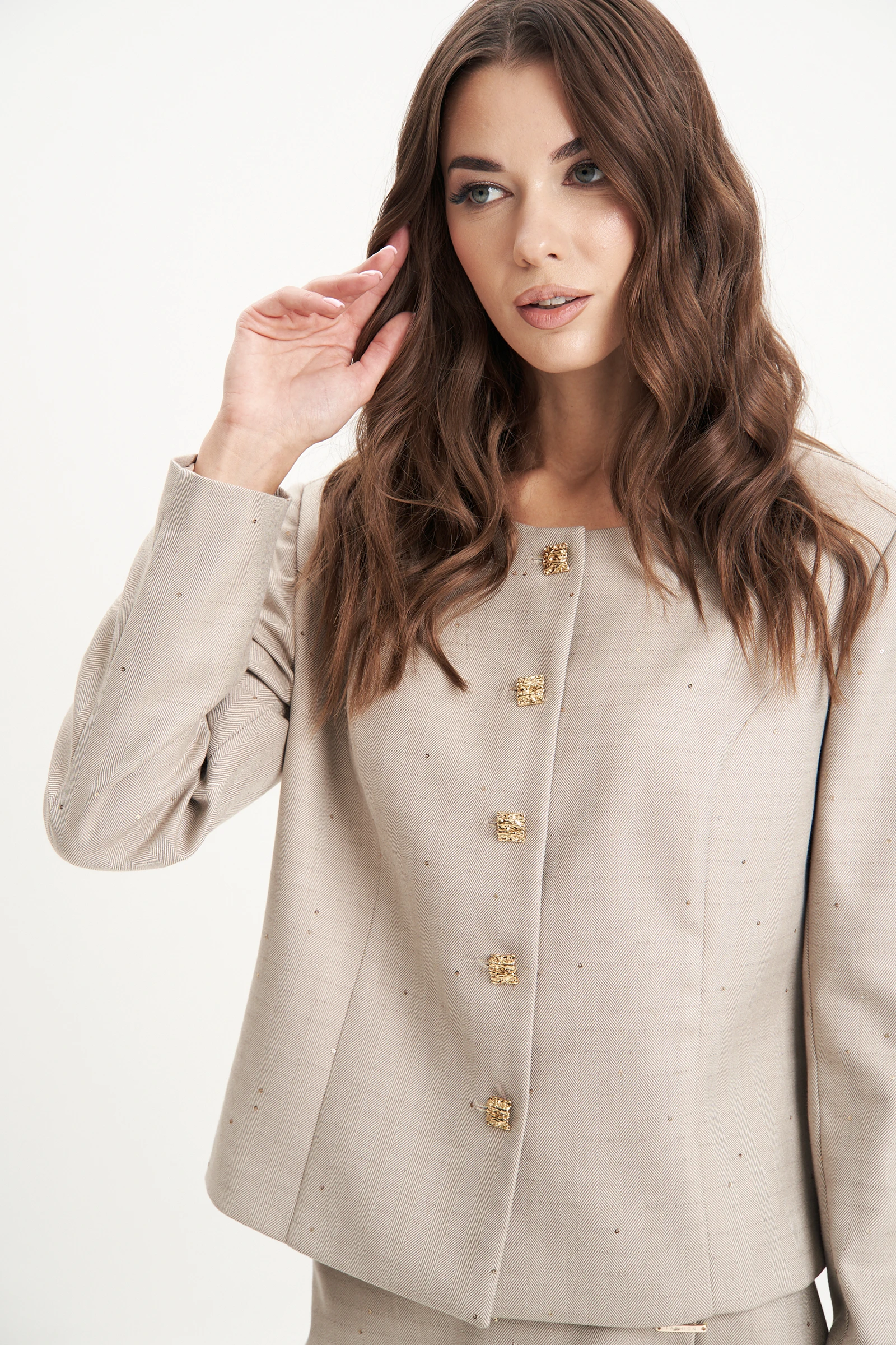 Жакет из необычного по текстуре материала с вкраплением пайетки, брюки из полотна без пайетки. Полуприлегающий силуэт пиджака с центральной застёжкой, круглым вырезом горловины и втачным покроем. Полочка с фигурным рельефом, спинка с фигурным рельефом, центральным швом и плечевыми вытачками. Рукав двухшовный.