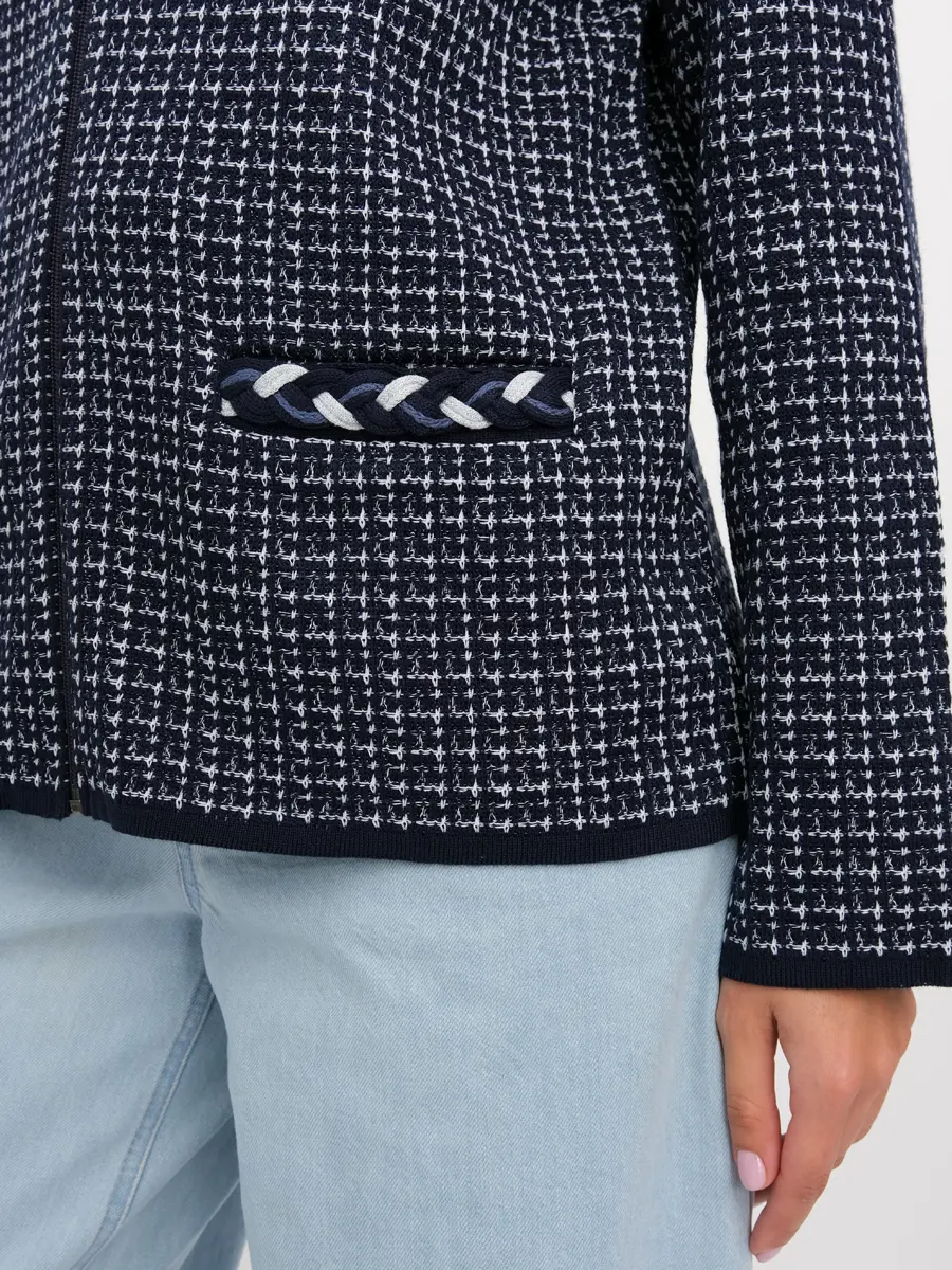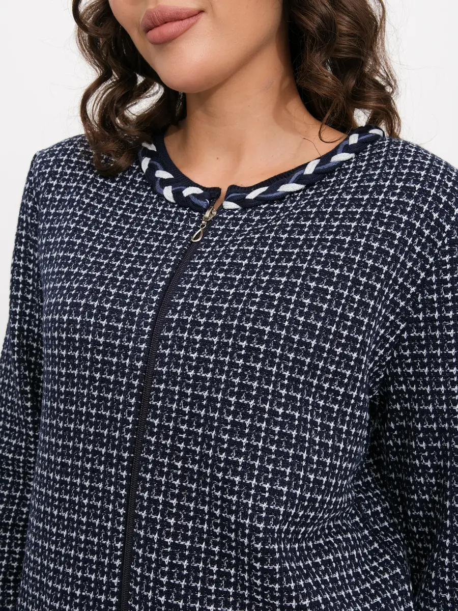 Жакет женский полуприлегающего силуэта с круглой горловиной.  Жакет вязаный на молнии.  Выполнен жаккардовым, структурным переплетением рисунок клетка. Горловина и  линия входа в карман декорированы  косами, которые выполнены из переплетающихся вязаных шнурков.