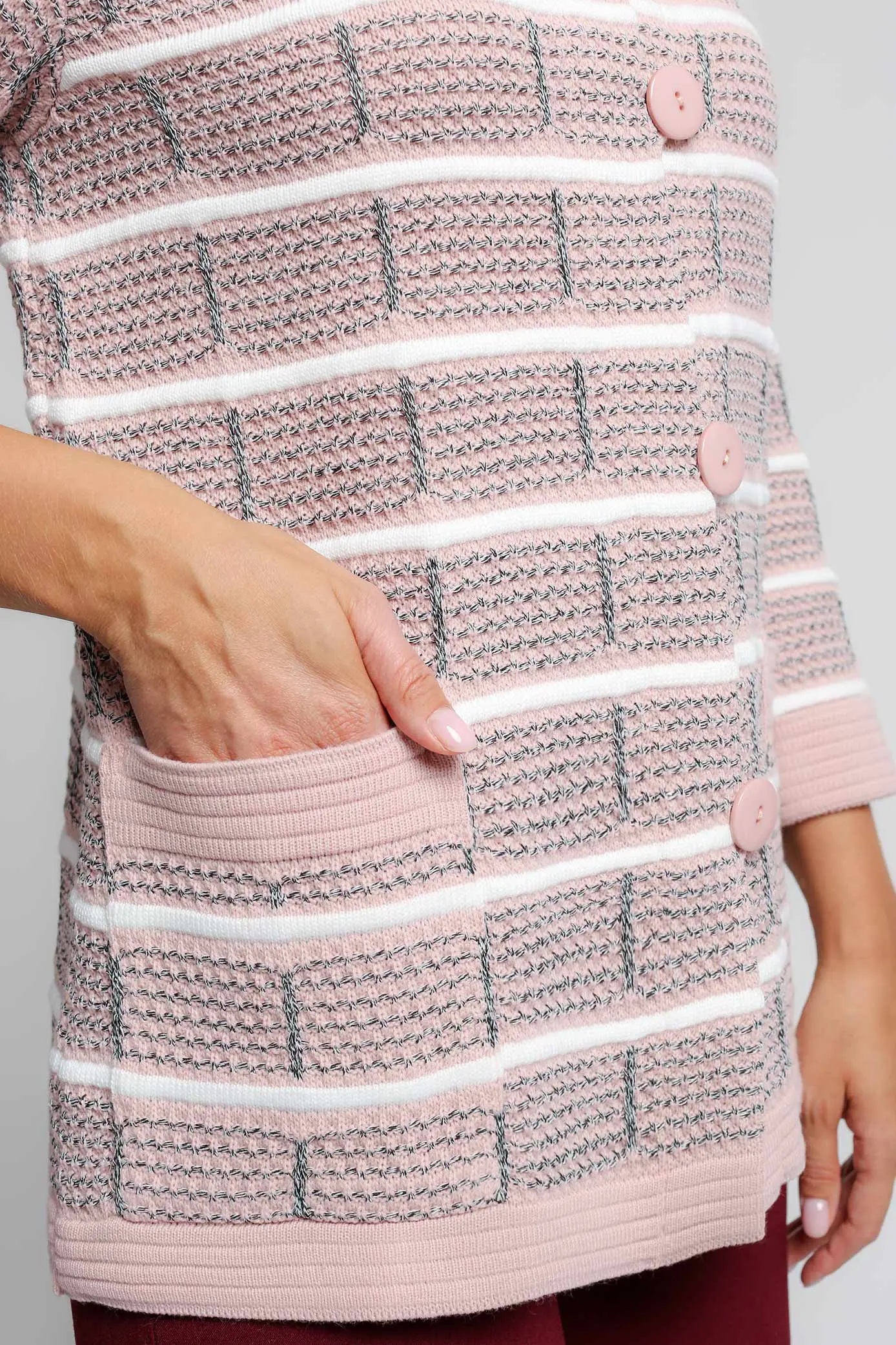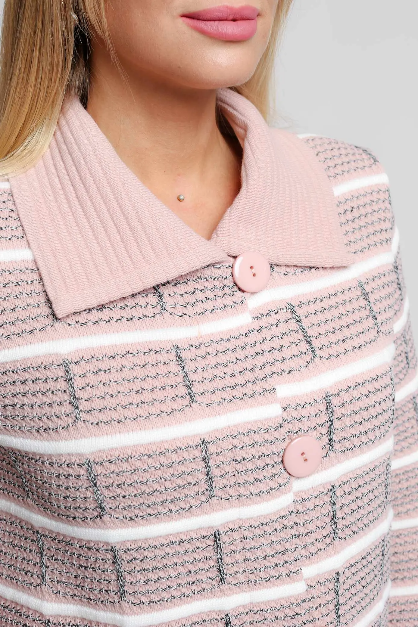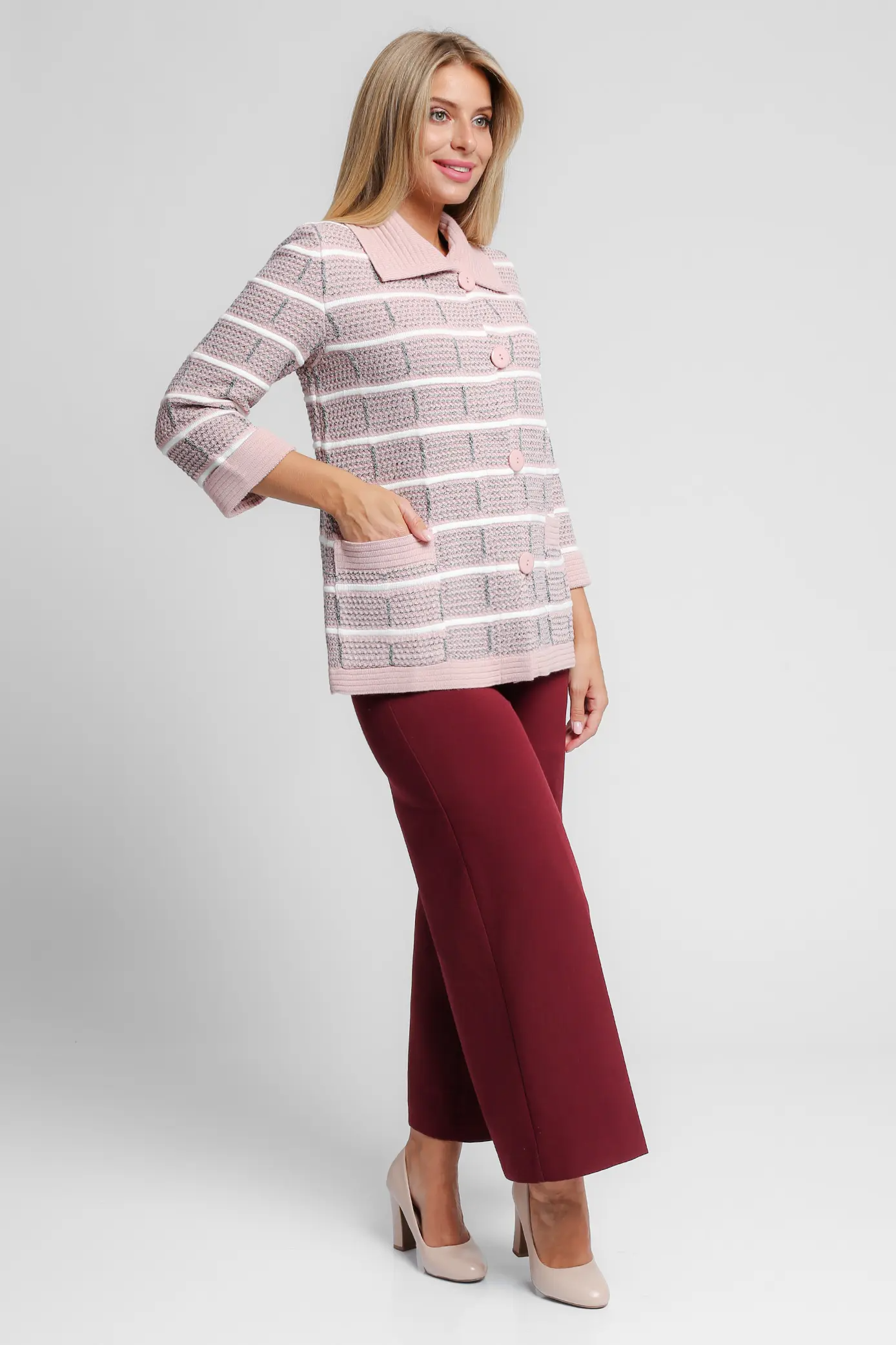 Вязаный женский жакет свободного силуэта с рубашечным отложным воротником.  Рукав втачной длиной 7/8 с отворотом.  По бокам два накладных кармана с листочкой. Жакет застегивается на пуговицы с навесной петлей. Изделие выполнено жаккардовым переплетением  образующим валики. пудра